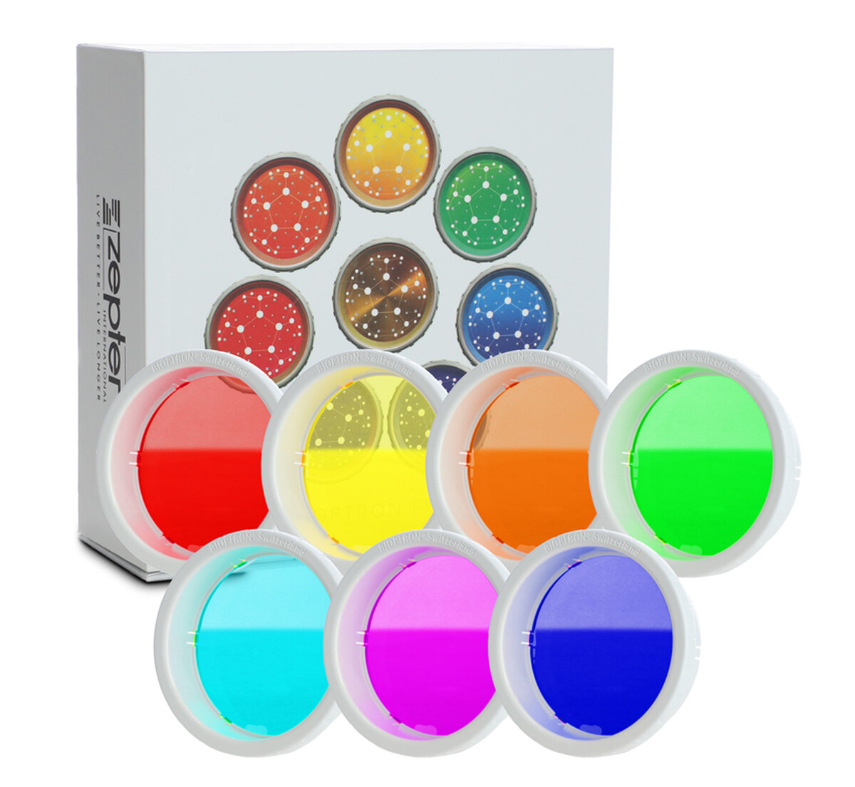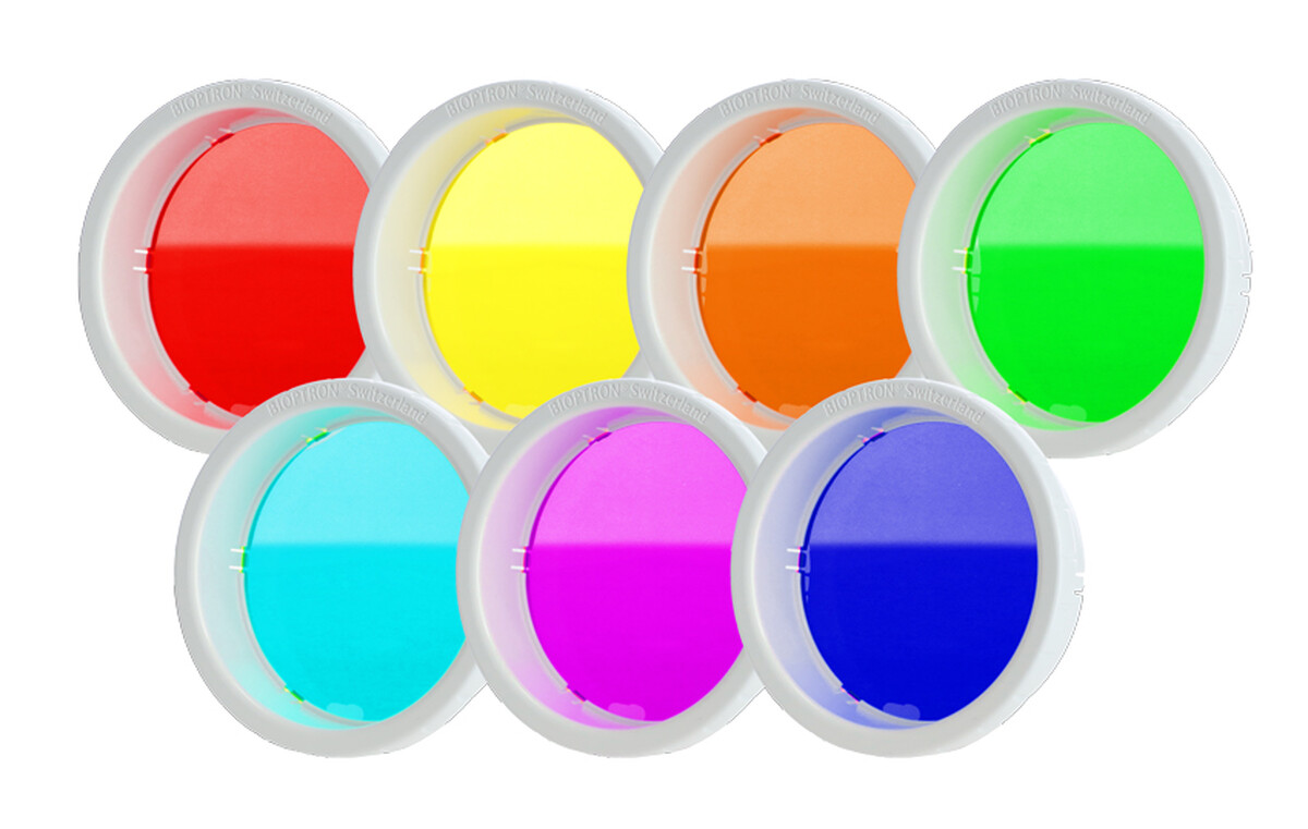Sada 7 sklenených farebných filtrov k biolampe Bioptron Pro 1 pôsobí na hlavné energetické centrá tela, čím umocňuje účinky aplikovanej liečby. Kolorterapia je jemná, bezpečná a efektívna. Filtre majú priemer cca 11 cm.