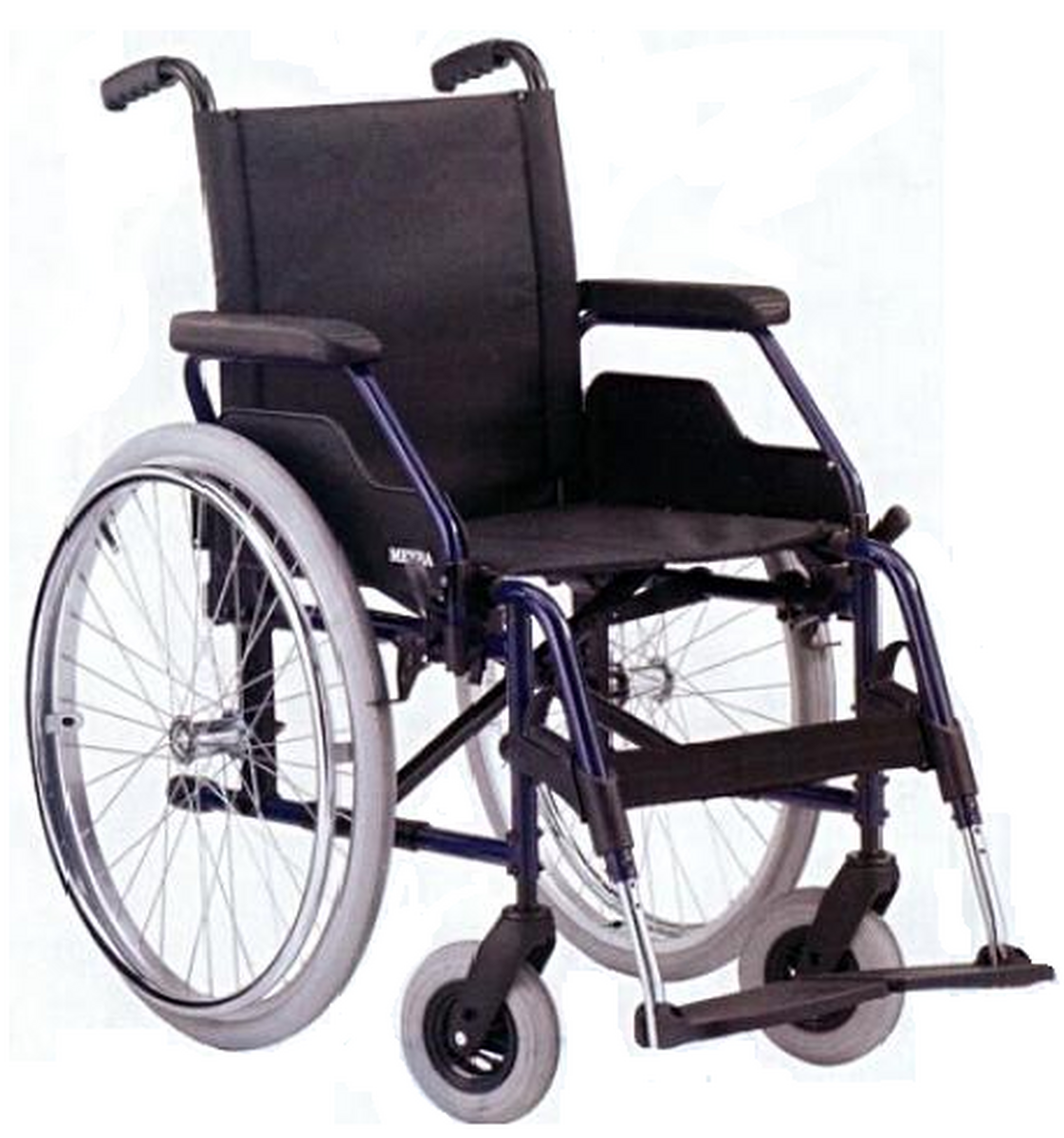 Skladací mechanický hliníkový invalidný vozík s delenou, výškovo nastaviteľnou stupačkou, rýchloúpínacími kolesami, prítlačnými brzdami, s opierkou chrbta so zalomením a s pevnou konštrukciou v striebornej a modrej farbe.