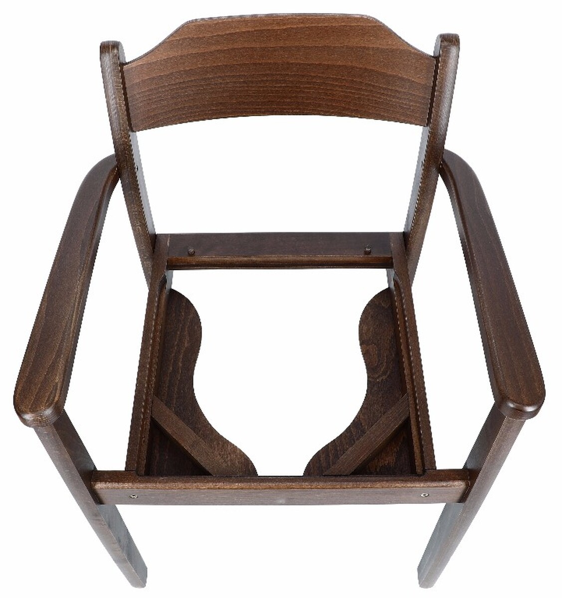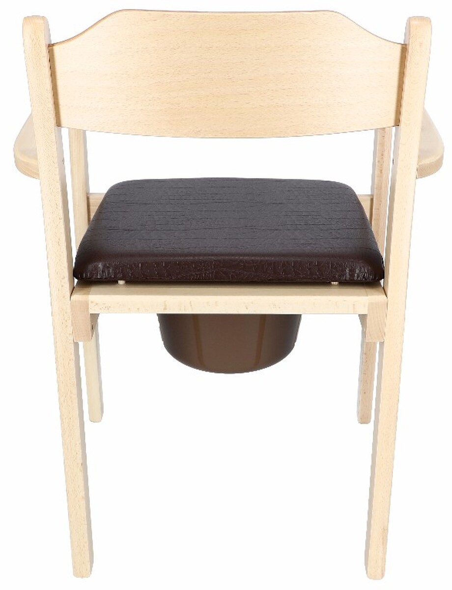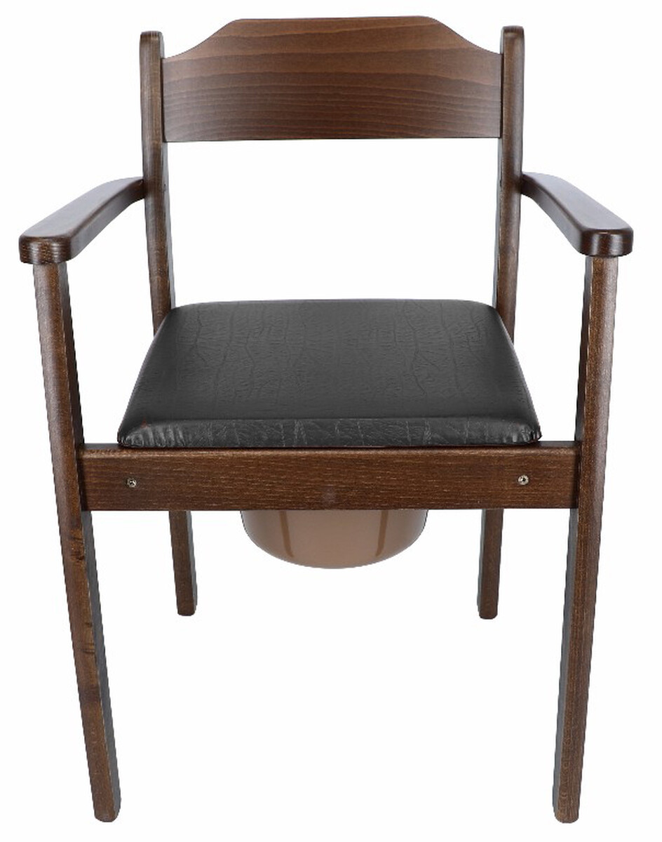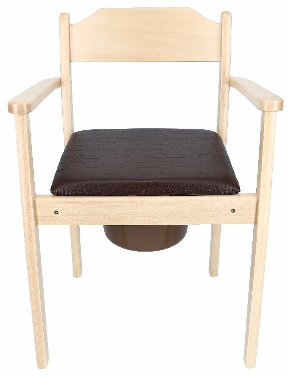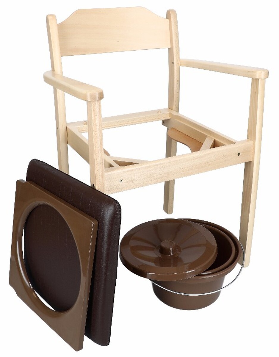 Drevená toaletná stolička s drevenou opierkou slúži ako náhrada WC pre pacientov, ktorí majú pohybové problémy.