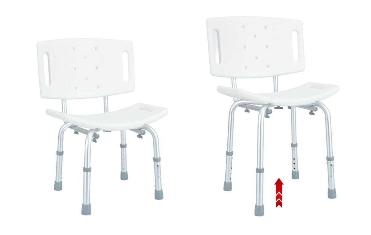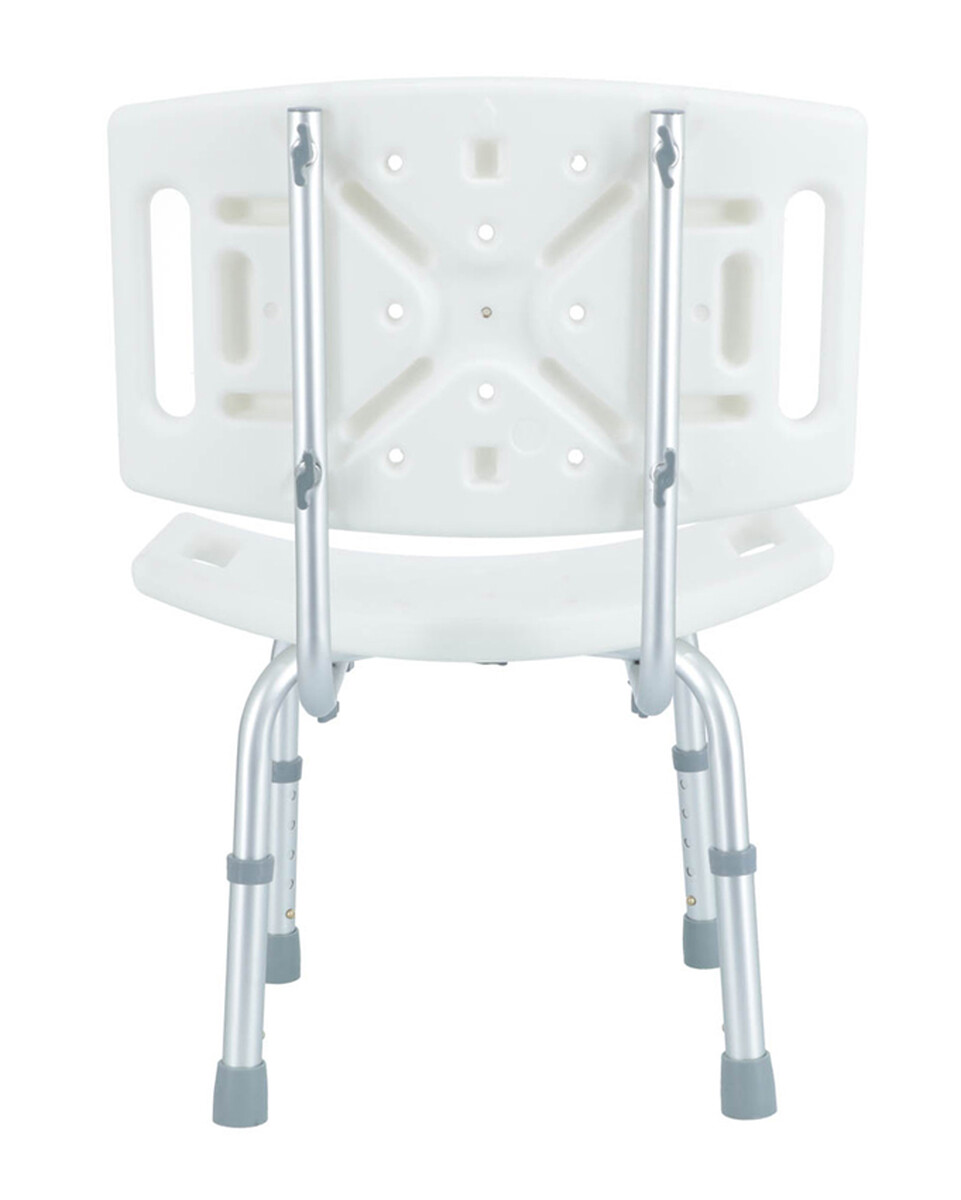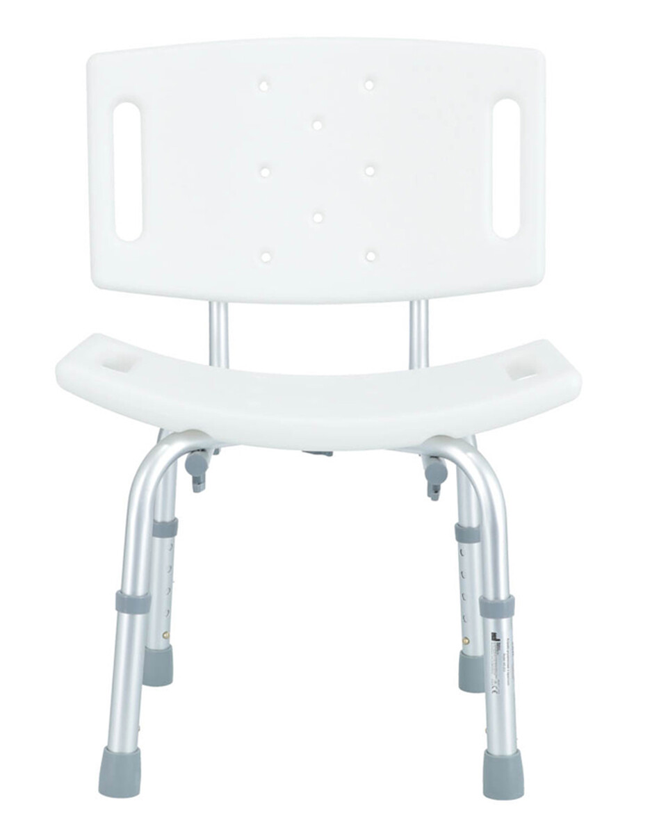 Výškovo nastaviteľná stolička do sprchy so širokým perforovaným operadlom a sedadlom. Má nehrdzavejúci hliníkový rám.