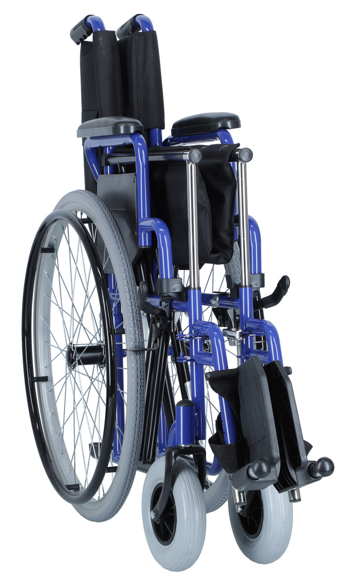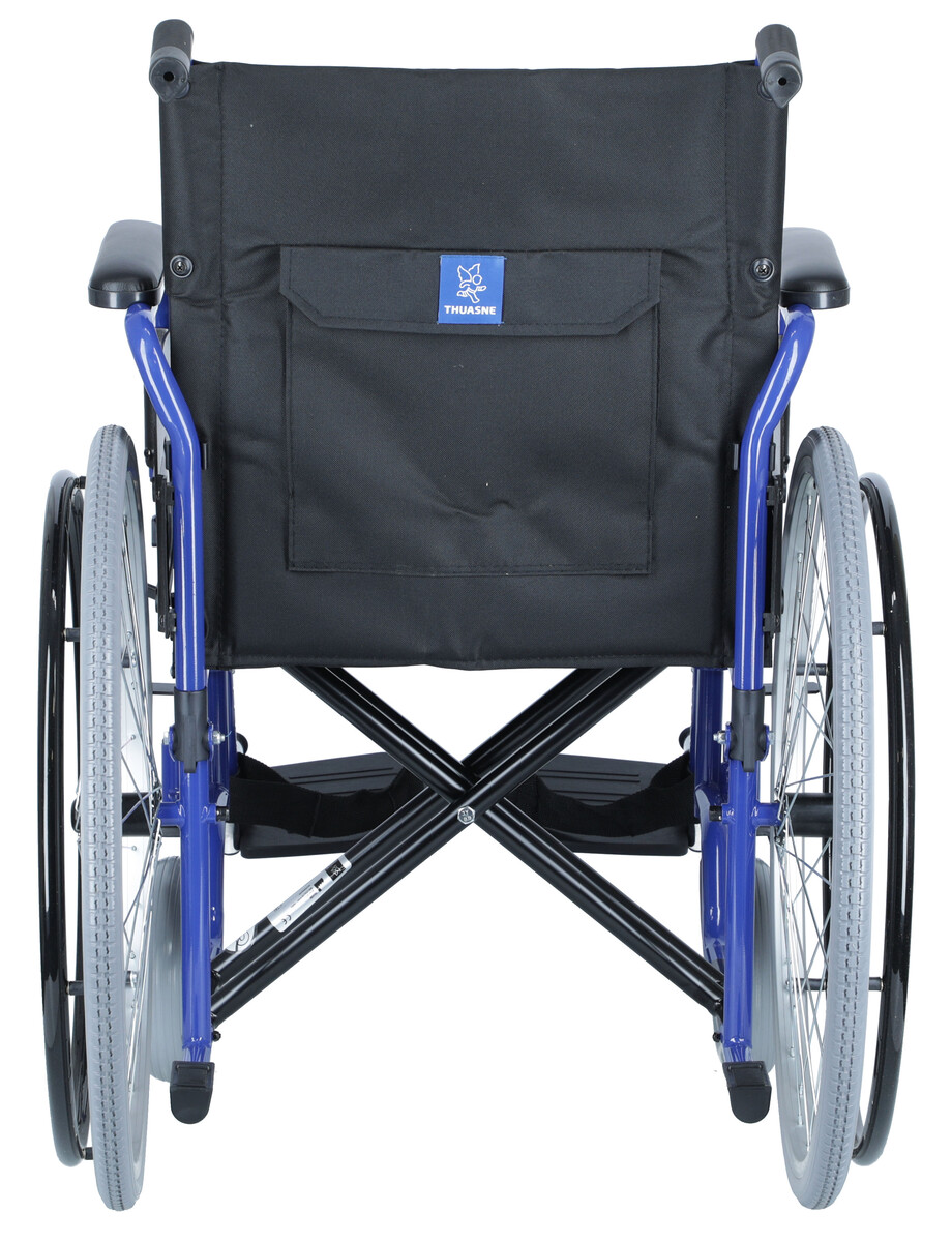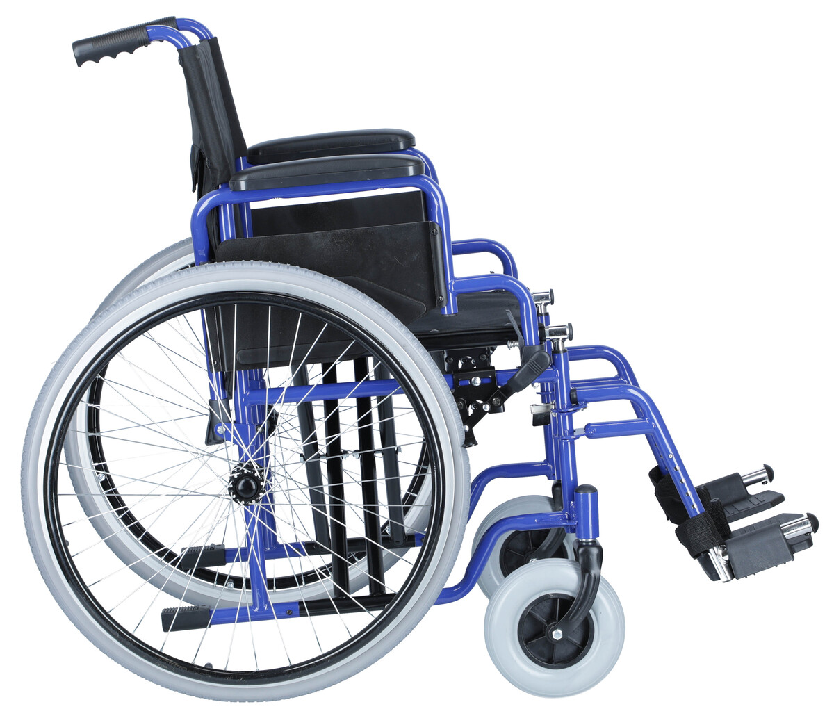 Invalidný skladací mechanický vozík pre imobilných pacientov je pevný, ľahko ovládateľný s nilónovým sedadlom, ľahko snímateľné zadné kolesá a stúpačky, predné a zadné kolesá s pevnými pneumatikami.