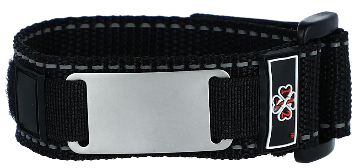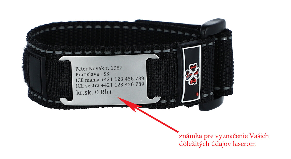 Textilný náramok so zapínaním na suchý zips oceníte pre jeho prispôsobivosť a jednoduchosť zapínania. Je vyrobený z jemného materiálu vysokej kvality. Saténovo-matný povrch nerezovej známky na náramku zachová potrebné údaje pri bezprostrednom ohrození života všade a za každého počasia.