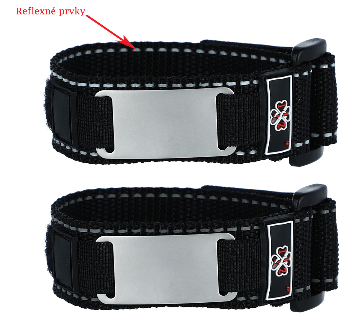 Náramok na suchý zips s obojstrannou nerezovou známkou. Obruba náramku je šitá reflexnou niťou.