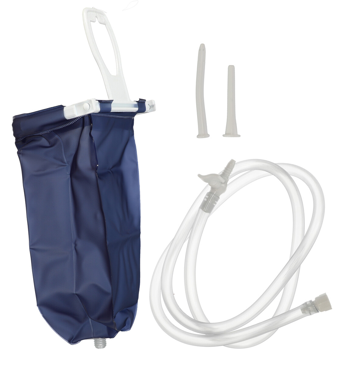 Súpravu zložíte tak, že vak zavesíte na vhodné miesto podľa Vášho uváženia. K nádobe pripojíte alebo zaskrutkujete spojovaciu hadičku, na jej druhý koniec zasuniete uzatvárací ventil. Na ventil naskrutkujete vaginálny alebo rektálny nadstavec podľa úkonu, ktorý sa chystáte spraviť. PVC bez obsahu ťažkých kovov.