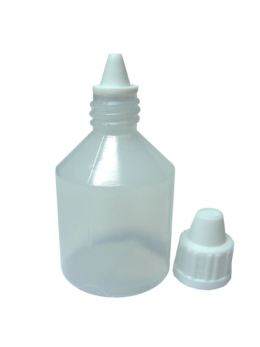 Dávkovacia fľaštička vyrobená z priesvitného plastu s kvapkacou vložkou a vrchnáčikom.