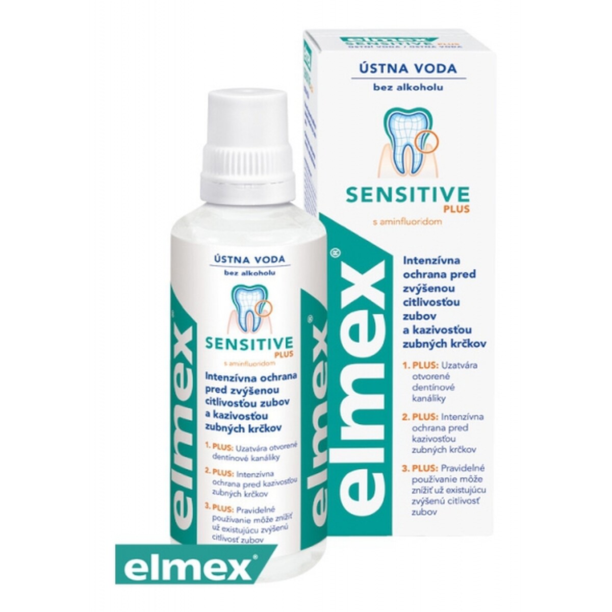 Ústna voda Elmex Sensitive Plus obsahuje vysoko účinný aminfluorid, ktorý vytvára na zubných krčkoch ochranný film, a tak zabraňuje nepriaznivým vplyvom a tvorbe zubného kazu. Denné používanie Elmex SENSITIVE Plus ústnej vody, Elmex SENSITIVE Plus zubnej pasty a Elmex SENSITIVE zubnej kefky vytvára účinný ochranný a čistiaci systém pre pacientov s odhalenými zubnými krčkami.