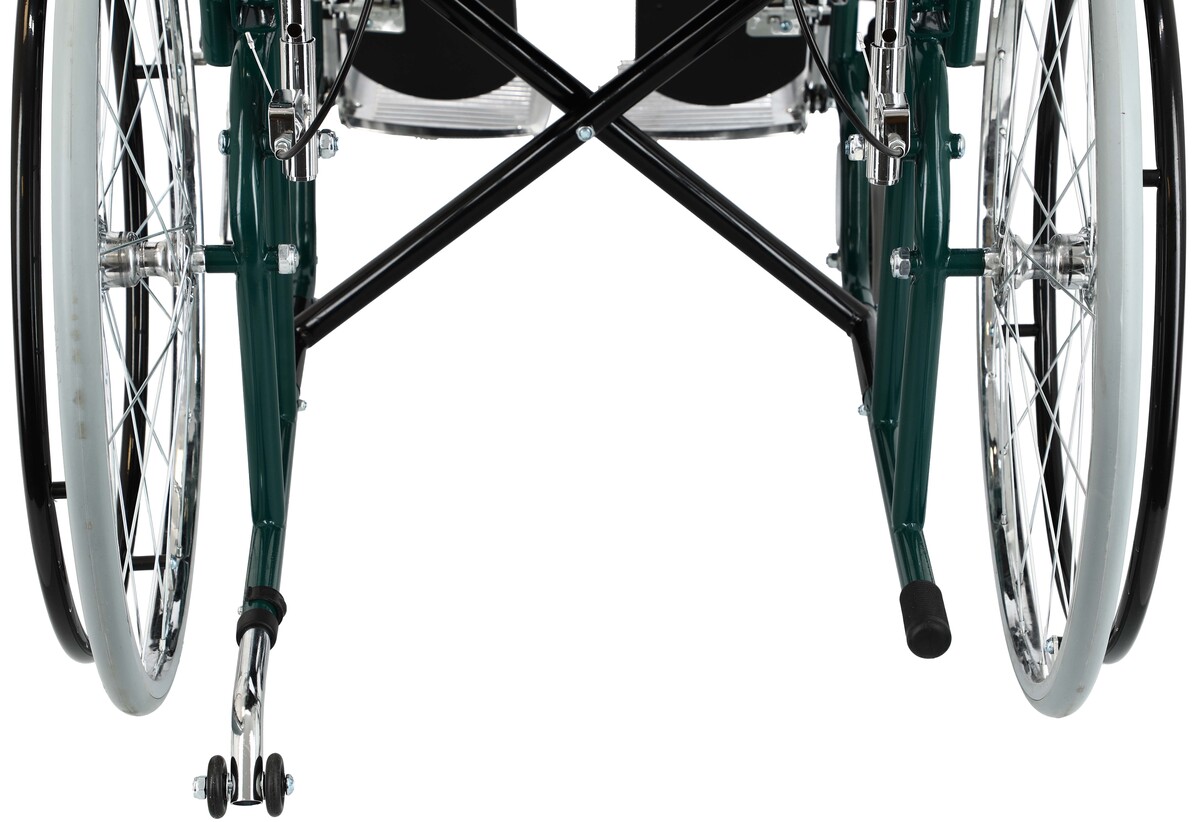 Predné aj zadné kolieska sú vyrobené z plnej gumy. V zadnej časti vozíka na ľavej strane sa nachádza koliesko, ktoré zabraňuje preklopeniu vozíka dozadu.
