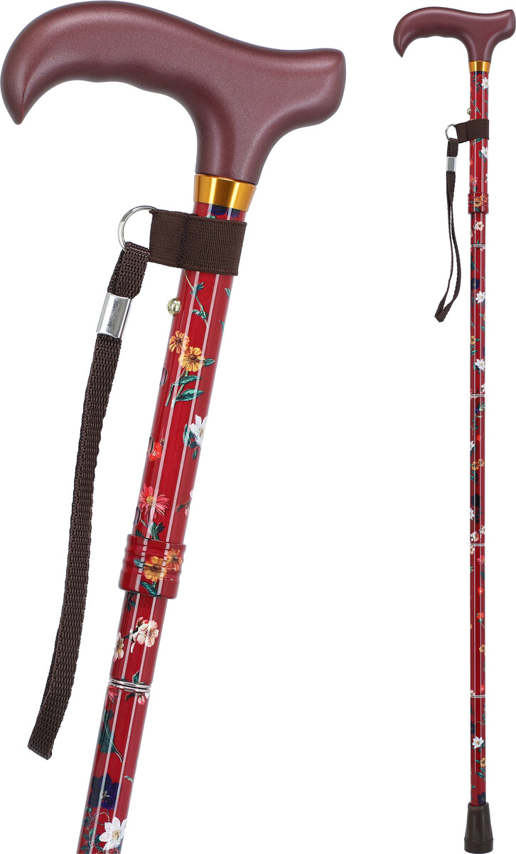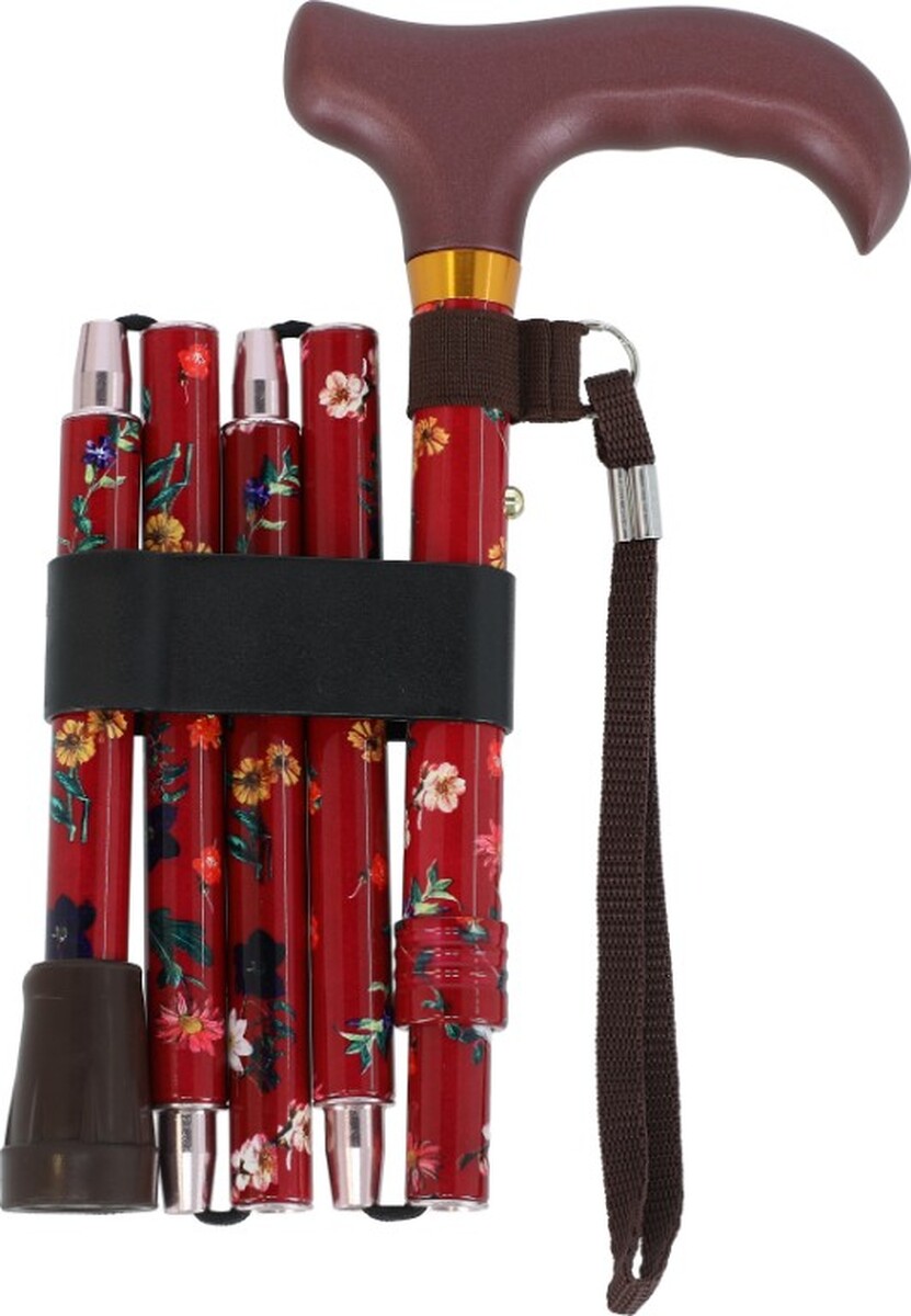 Farebná kvietkovaná skladacia palička s anatomickou rukoväťou je určená na podporu pri chôdzi. Je chránená gumovým zakončením pre bezpečné a bezhlučné používanie.