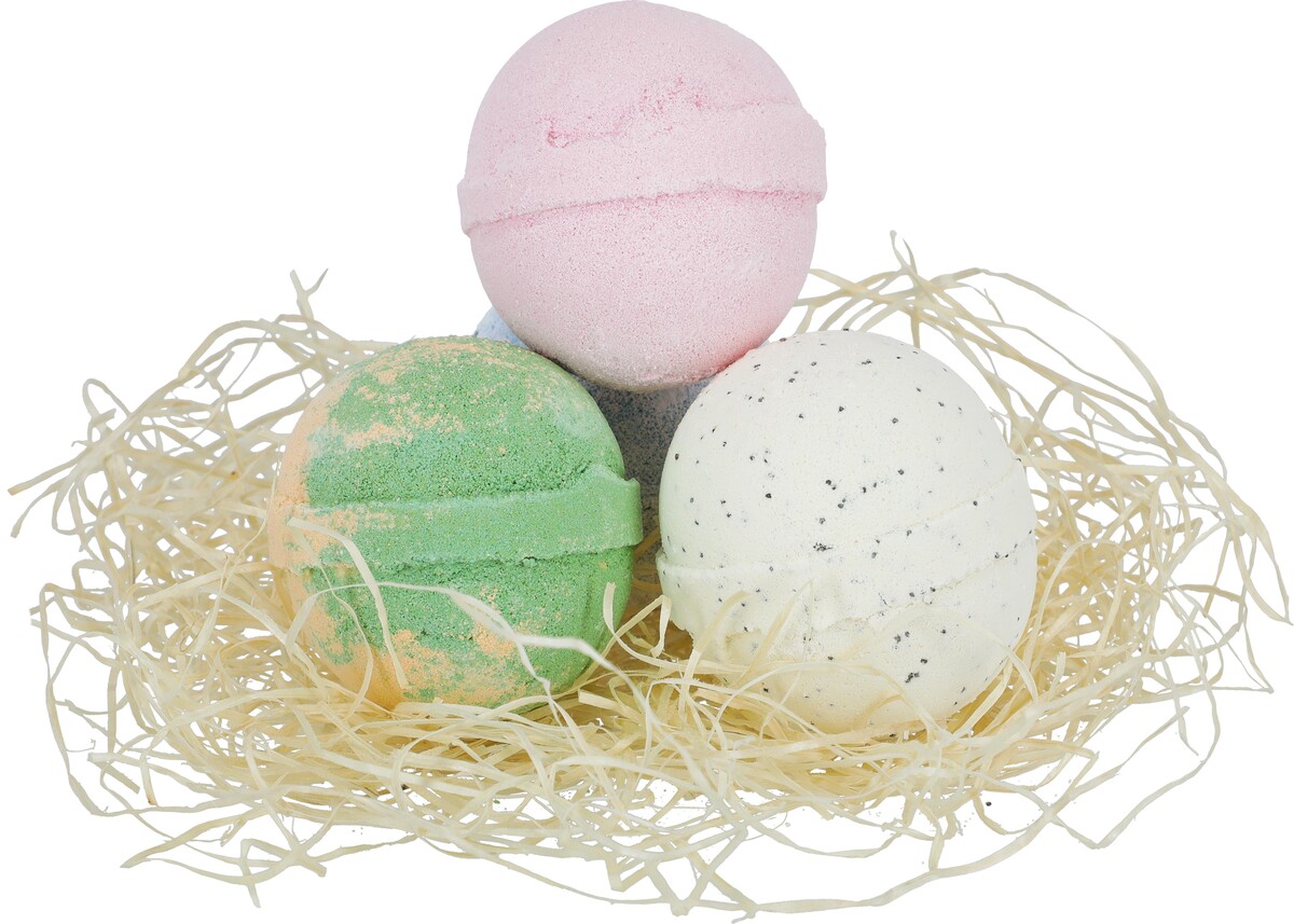 Spríjemníte si kúpeľ šumivými bombami do kúpeľa s obsahom kokosového oleja a  farebných mydlových peelingov.