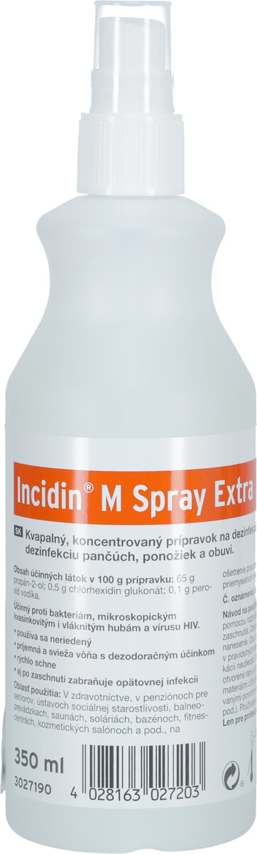 Kvapalný koncentrovaný prípravok Incidin M Spray Extra je vhodný na dezinfekciu pokožky nôh, pančúch, ponožiek či obuvi.