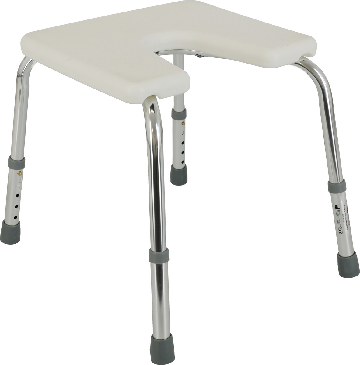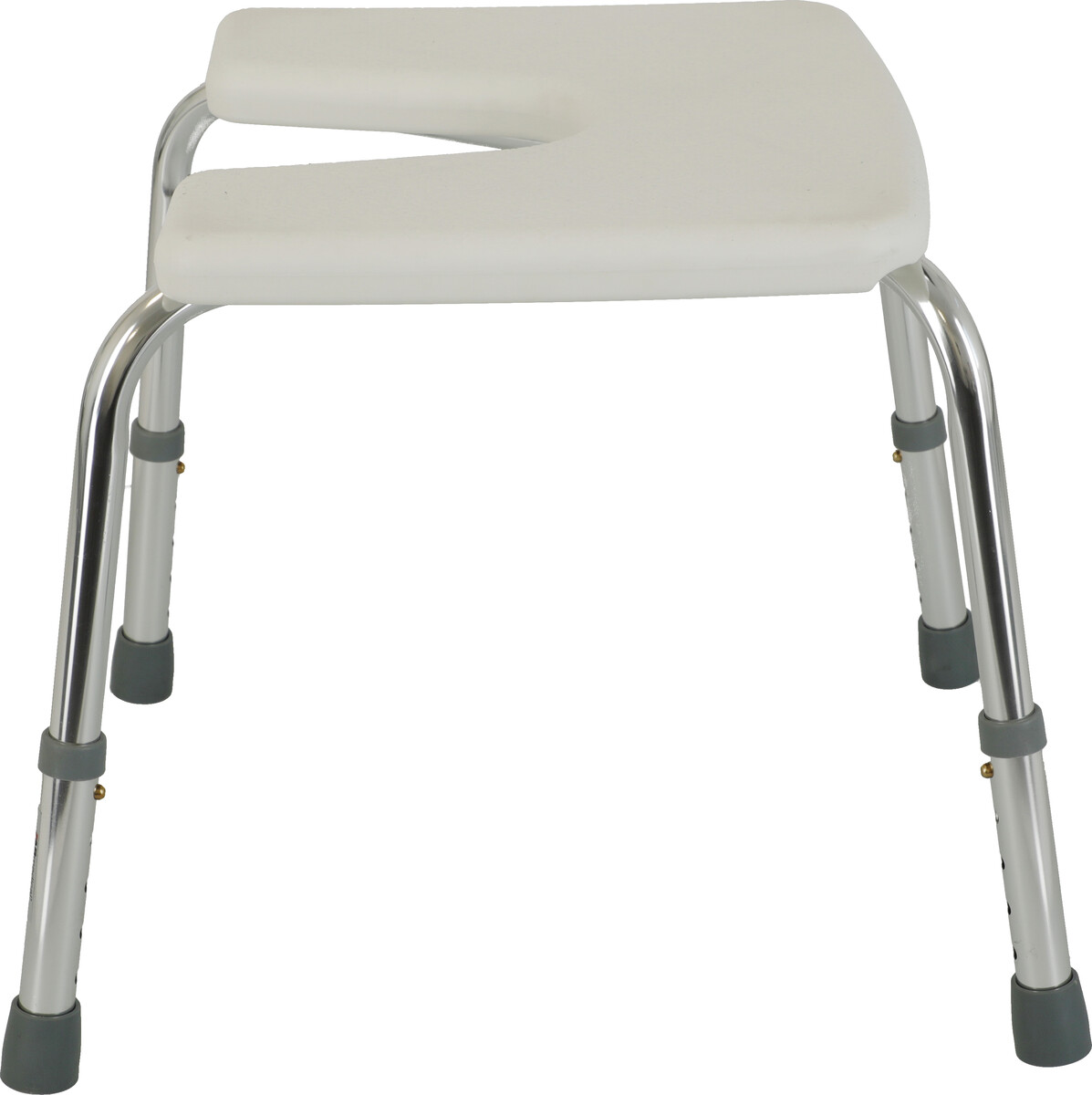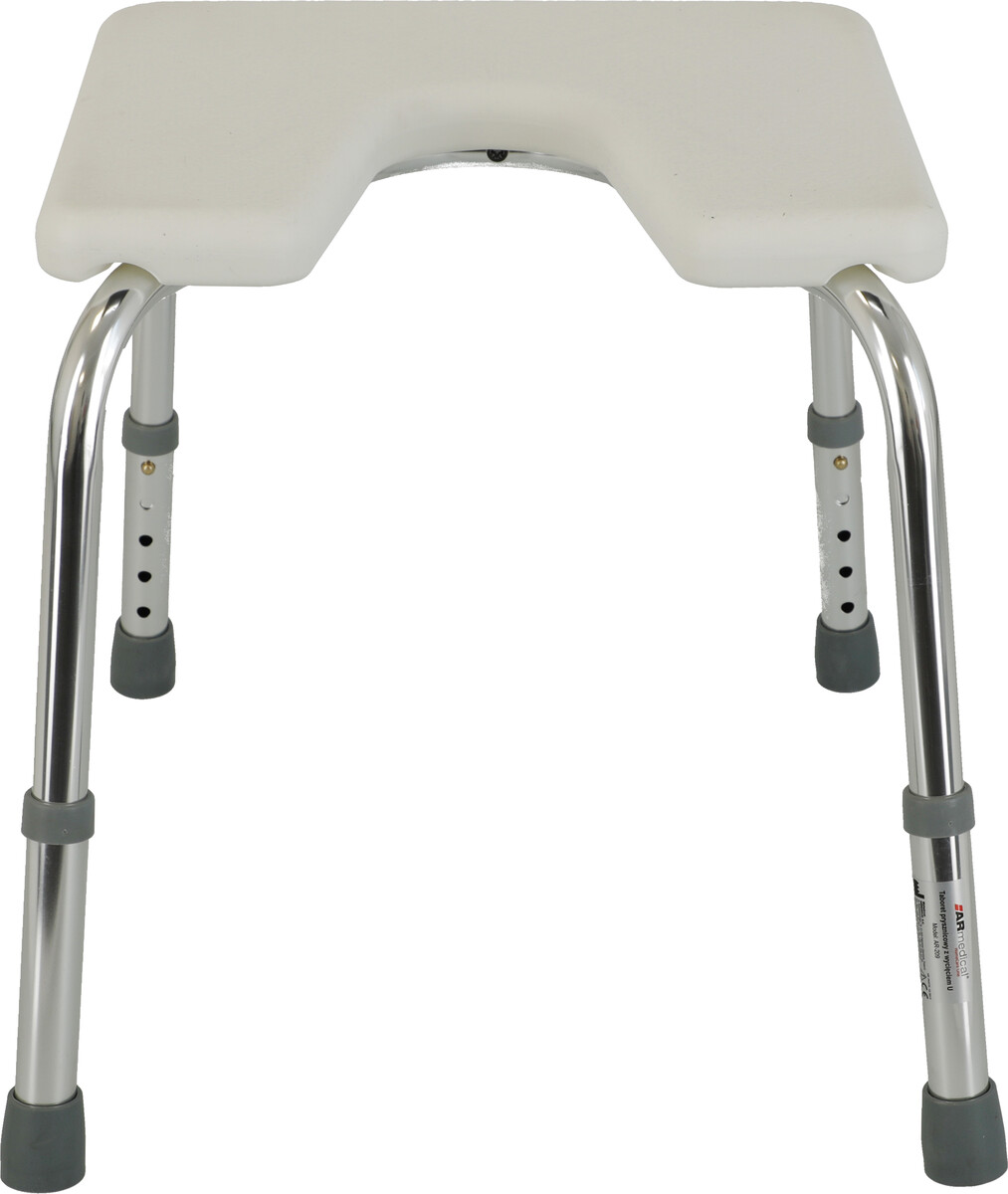 Sprchovací stolček s výrezom na osobnú hygienu s výškovo nastaviteľnými nožičkami vhodný do sprchy aj vane. Rám je vyrobený z hliníka a sedadlo z plastu.