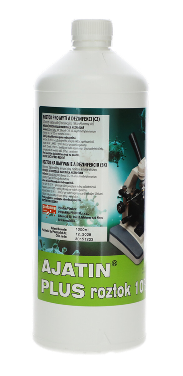Ajatín plus 10% je dezinfekčný roztok, ktorý slúži na dezinfekciu povrchov a predmetov rôznych materiálov. Má silný antibakteriálny účinok, pôsobí aj proti kvasinkám, plesniam, hubám, riasam a niektorým vírusom. Tento prostriedok nemá žiadne vedľajšie účinky, nezapácha, nefarbí. Je určený na prípravu 1% dezinfekčného roztoku.
