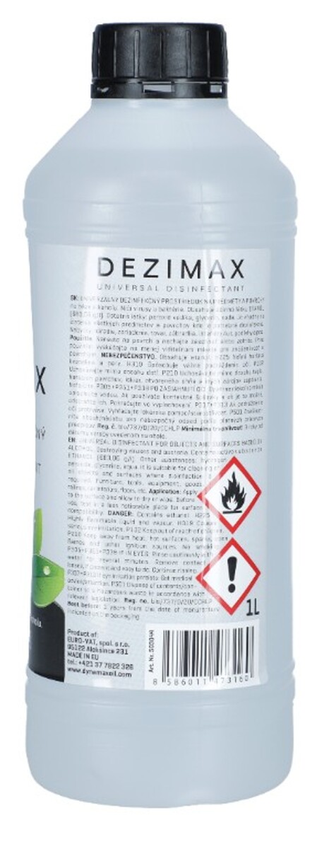 Univerzálny dezinfekčný prípravok DEZIMAX na báze alkoholu slúži na efektívnu dezinfekciu a čistenie rúk, predmetov i povrchov. Vďaka svojmu zloženiu s etanolom v koncentrácii 683,06 g/l zaručuje efektívnu ochranu v rámci každodennej prevencie voči kontaminácii baktériami a vírusmi.
