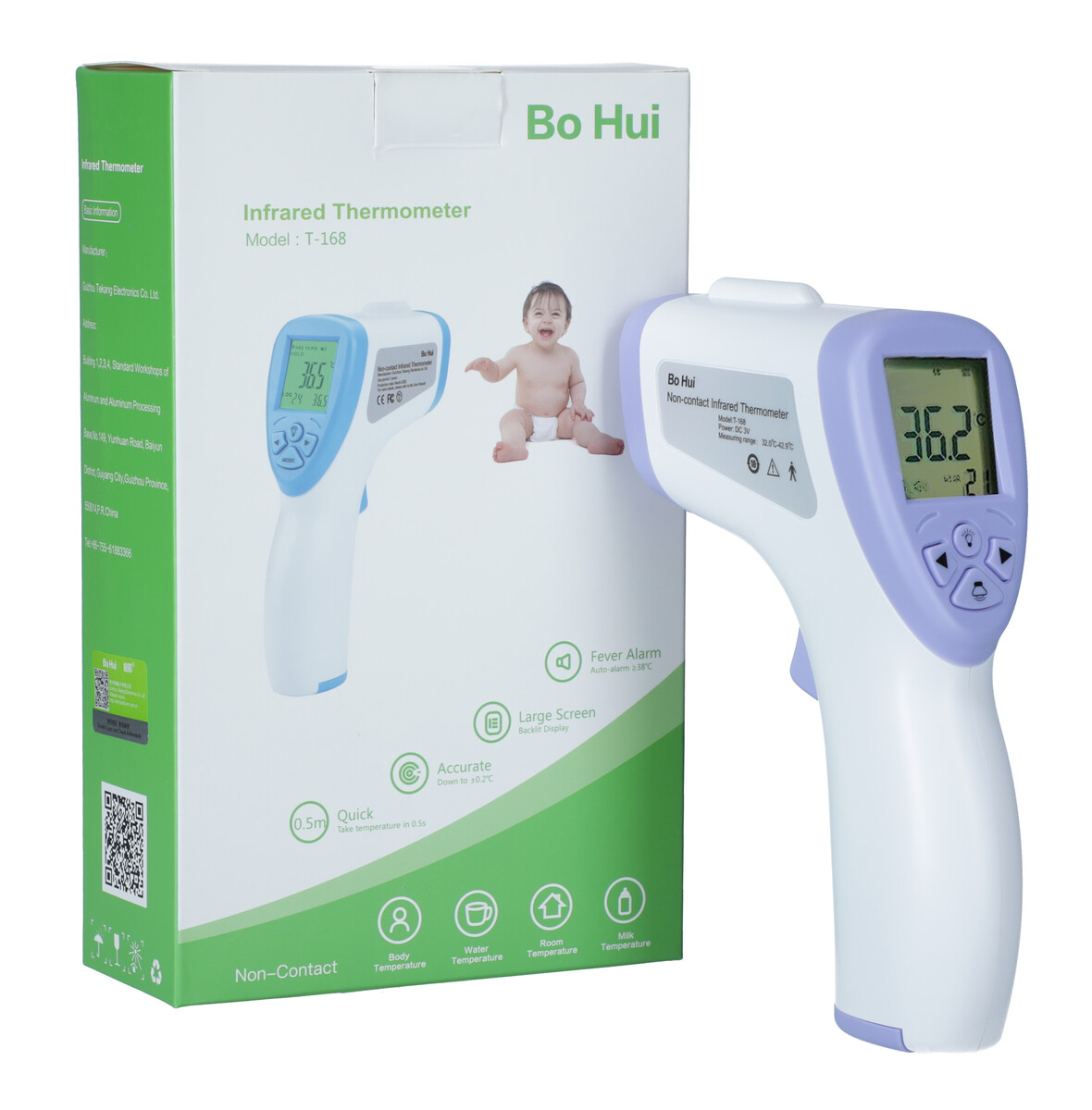 Bo Hui T-168 je vysoko kvalitný bezkontaktný infračervený teplomer s najnovšími technológiami, ktoré umožňujú jednoduché a presné meranie teploty bez nutnosti dotyku s meraným objektom. Okrem telesnej teploty ho využijete aj na meranie teploty prostredia, vzduchu, tekutín či predmetov. Teplomer umožňuje rýchle po sebe nasledujúce merania, pričom v pamäti dokáže uchovať až 32 meraní.