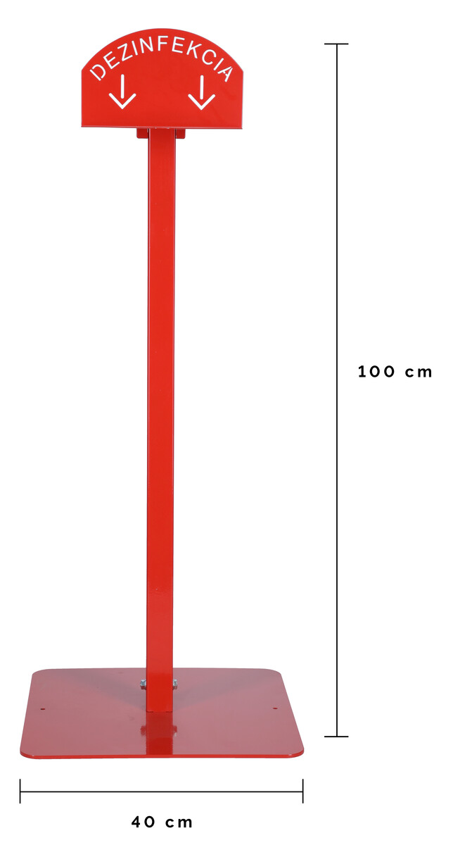 Stojan na dezinfekciu rúk má červenú farbu a informačný nápis.