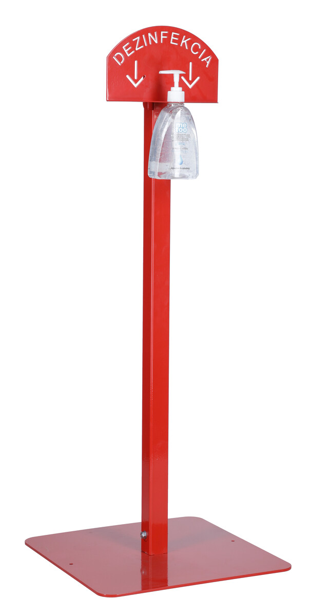 Stojan na dezinfekciu rúk má červenú farbu a informačný nápis.