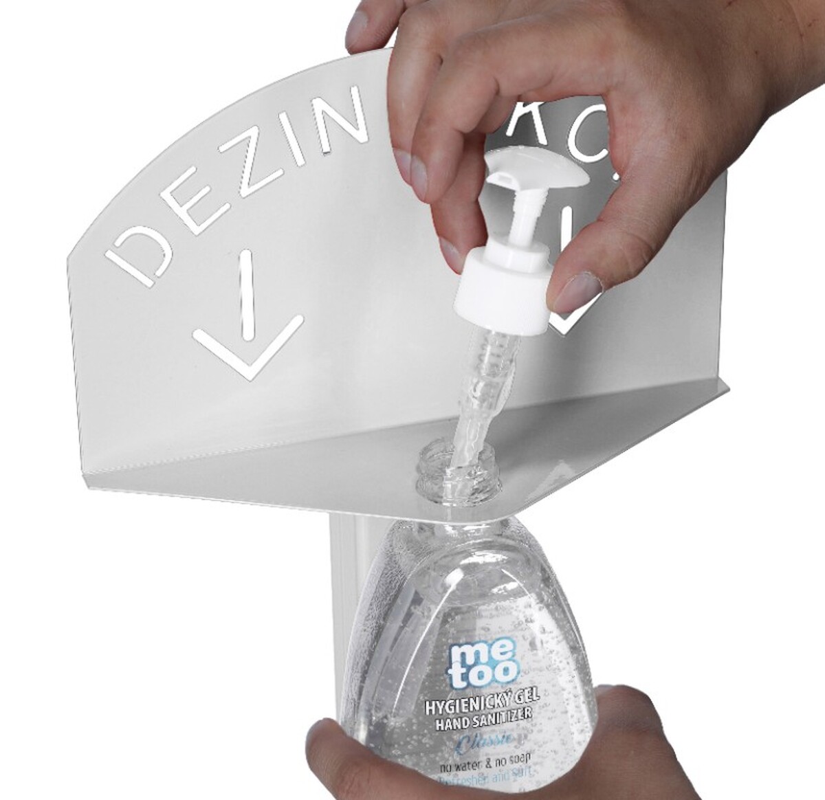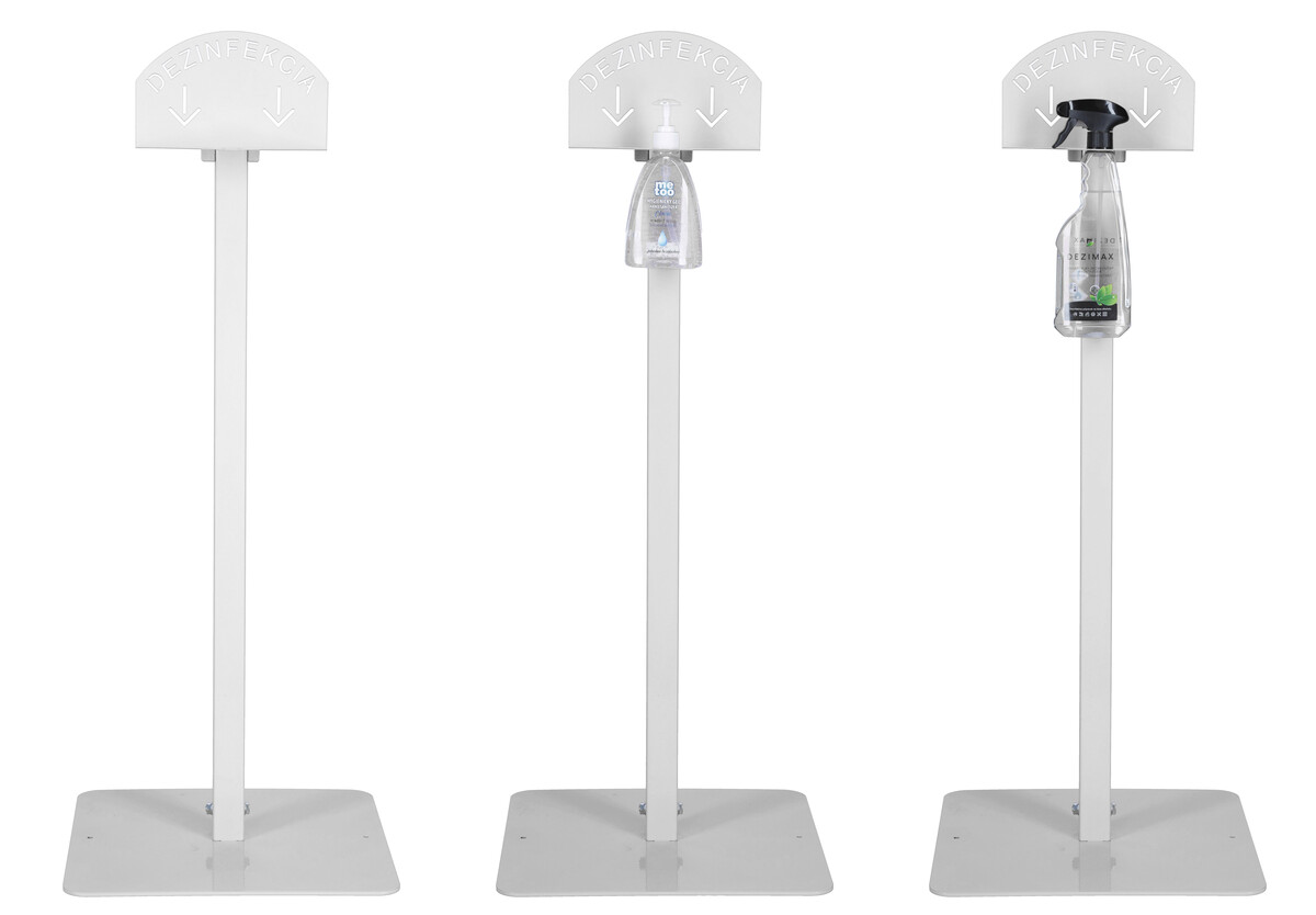 Univerzálny kovový stojan na upevnenie dezinfekčných prostriedkov na ruky pred vstupom do prevádzok.