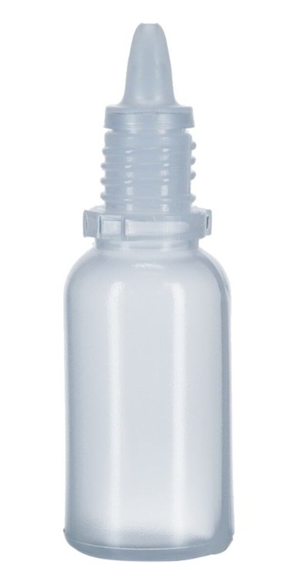 Sterilná dávkovacia fľaštička vyrobená z priesvitného plastu s kvapkacou vložkou a vrchnáčikom.
