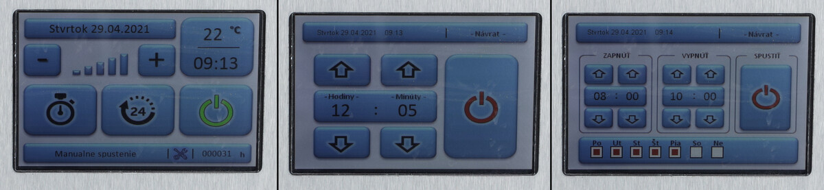 Prehľadný displej umožňuje používateľovi nastaviť si vlastný čas prevádzky zariadenia, automatický štart, intenzitu ventilátora, ako aj dátum a jas obrazovky. Infražiarič je navyše vybavený farebným podsvietením, ktoré indikuje stav prevádzky – zelená farba pri zapínaní, modrá počas prevádzky, červená pri výskyte technického problému.