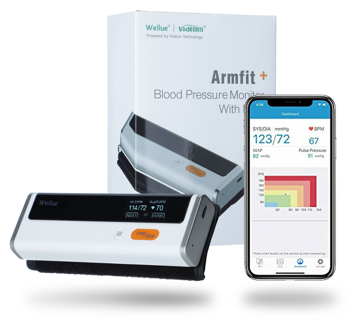 Vďaka dvom vstavaným citlivým elekródam vie Armfit+ poslúžiť ako elektrokardiograf, ktorý vám počas 30-tich sekúnd odmeria elektrickú aktivitu srdca, ktorú automaticky uloží do digitálnej formy elektrokardiogramu, ktorú následne viete zdielať aj ako PDF súbor so svojím ošetrujúcim lekárom. Všetky dáta sa ihneď po pripojení sťahujú do mobilnej aplikácie, kde si ich viete podrobnejšie pozrieť a zanalyzovať. Prístroj je navrhnutý tak, aby ste EKG mohli merať na štyroch rôznych miestach vášho tela.