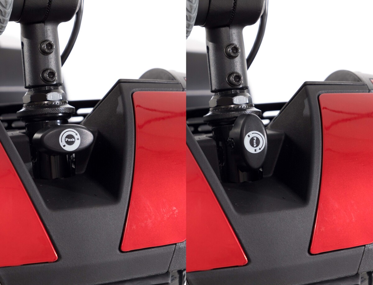 V zadnej časti na telese motora sa nachádza žltá aretačná páčka elektromagnetickej brzdy. V polohe dole je brzda aktívna - zabrzdená, resp. automaticky brzdí po uvolnení páčky pohybu dopredu, v polohe hore odbrzdená - so skútrom je možné voľne hýbať.