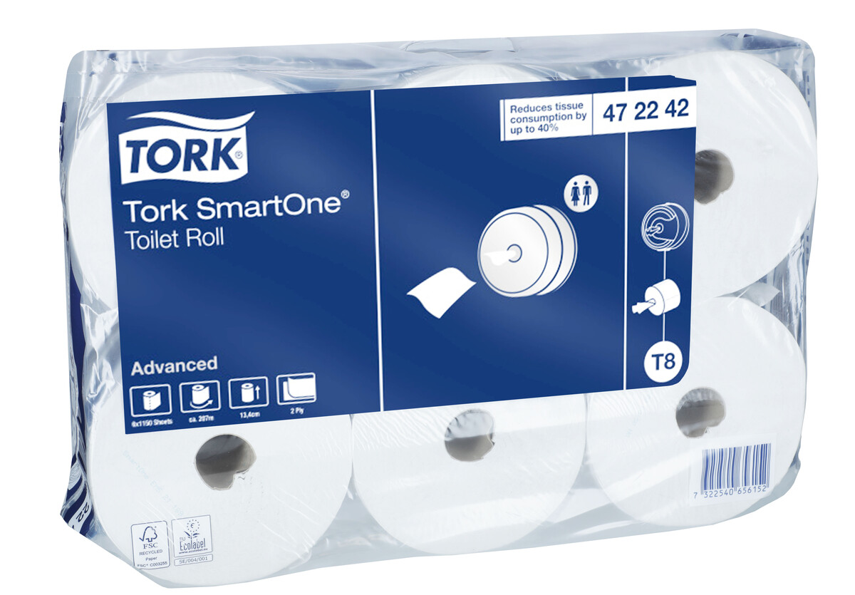 Toaletný papier Tork Smart One (T8) vo vysokokapacitnom kotúči so stredovým odvíjaním a systémom dávkovania po jednotlivých útržkoch znižuje spotrebu až o 40 % (v porovnaní s tradičnými automatickými kotúčmi Jumbo). Papier je príjemne mäkký a zároveň odolný.
