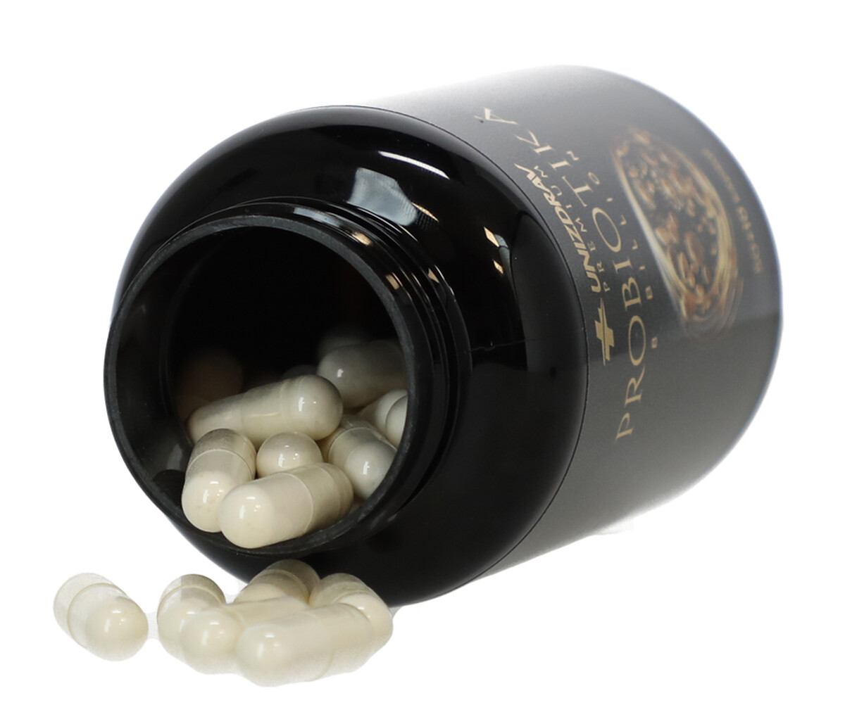 Výživový doplnok v kapsulách s obsahom probiotických kultúr.