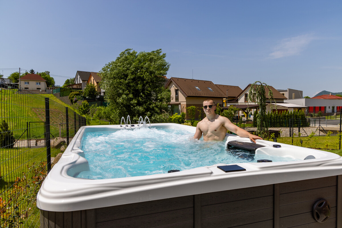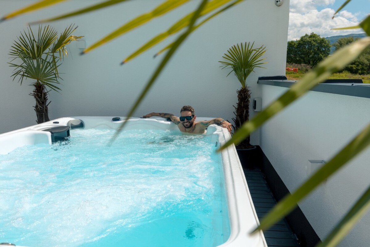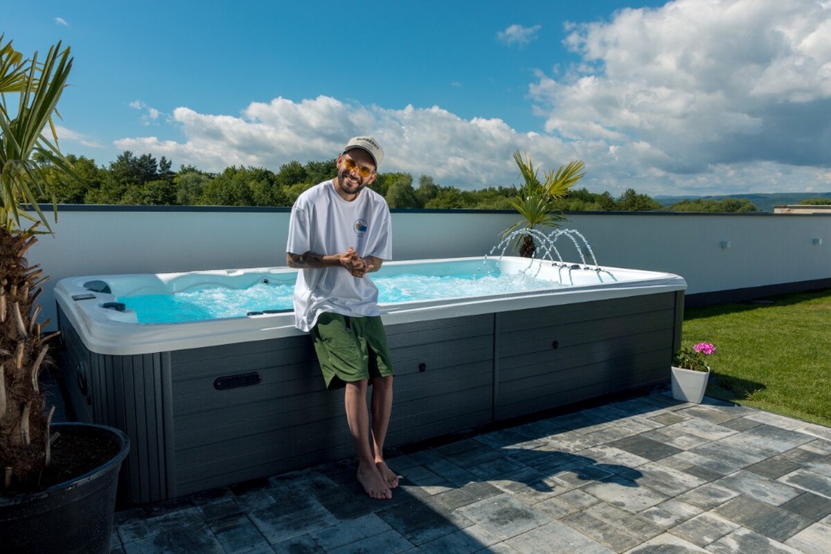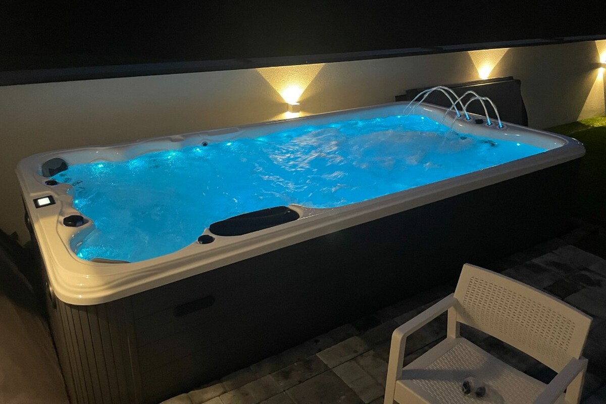 Celoročný bazén s protiprúdom a vírivkovou časťou, 2 miestami na sedenie a bohatou smart výbavou na dokonalý relax aj v pohodlí domova.
