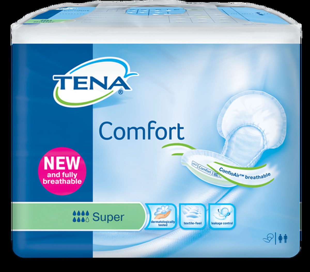 Plienky Tena comfort Super sú vhodné pre mobilných aj ležiacich pacientov bez ohľadu na rozmery pacienta. Poskytujú ochranu pri strednom až ťažkom úniku moču. Absorpčná schopnosť plienky je 2400 ml. Sú priedušné vďaka systému ConfioAir. Materiál po bokoch je podobný látke.