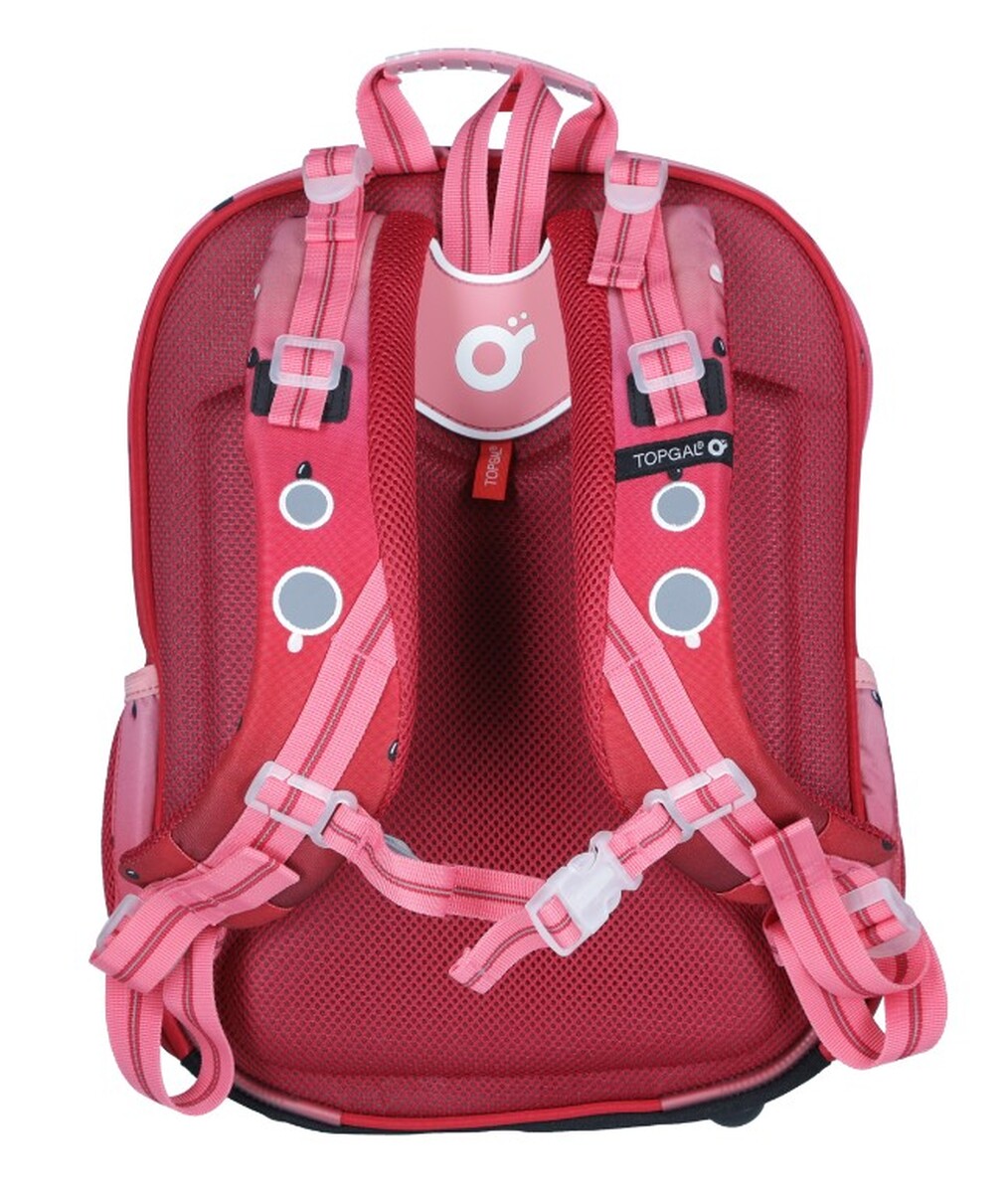 O správne držanie školskej tašky na chrbte sa postará spevnený chrbát z mäkkej lisovanej peny, vystužené nastaviteľné ramenné popruhy a hrudný pás. Popruhy sú anatomicky tvarované a postave sa prispôsobujú upínaním v hornej a spodnej časti, vďaka čomu budú správne sedieť aj na drobnom chrbte dieťaťa. Končeky popruhov sú vybavené magnetkami, takže nebudú pri nosení prekážať. Výškovo nastaviteľný hrudný pásik zasa zaistí, že popruhy neskĺznu ani z úzkych ramien.