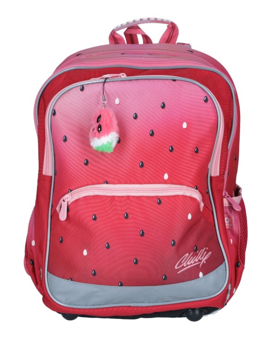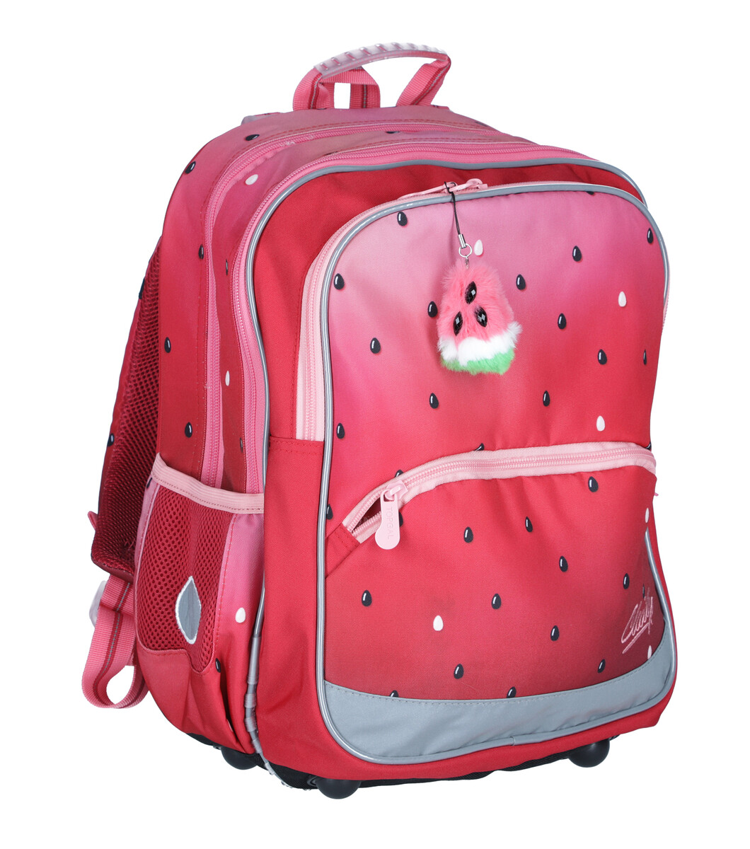 Školská taška BAZI s motívom melóna je vďaka svojim kompaktným rozmerom a nízkej hmotnosti ideálna pre malé školáčky na prvom stupni základných škôl. Pestrý dizajn doplnený o prívesok v tvare melóna určite poteší nejednu slečnu a váha necelý 1 kilogram zasa každého rodiča.