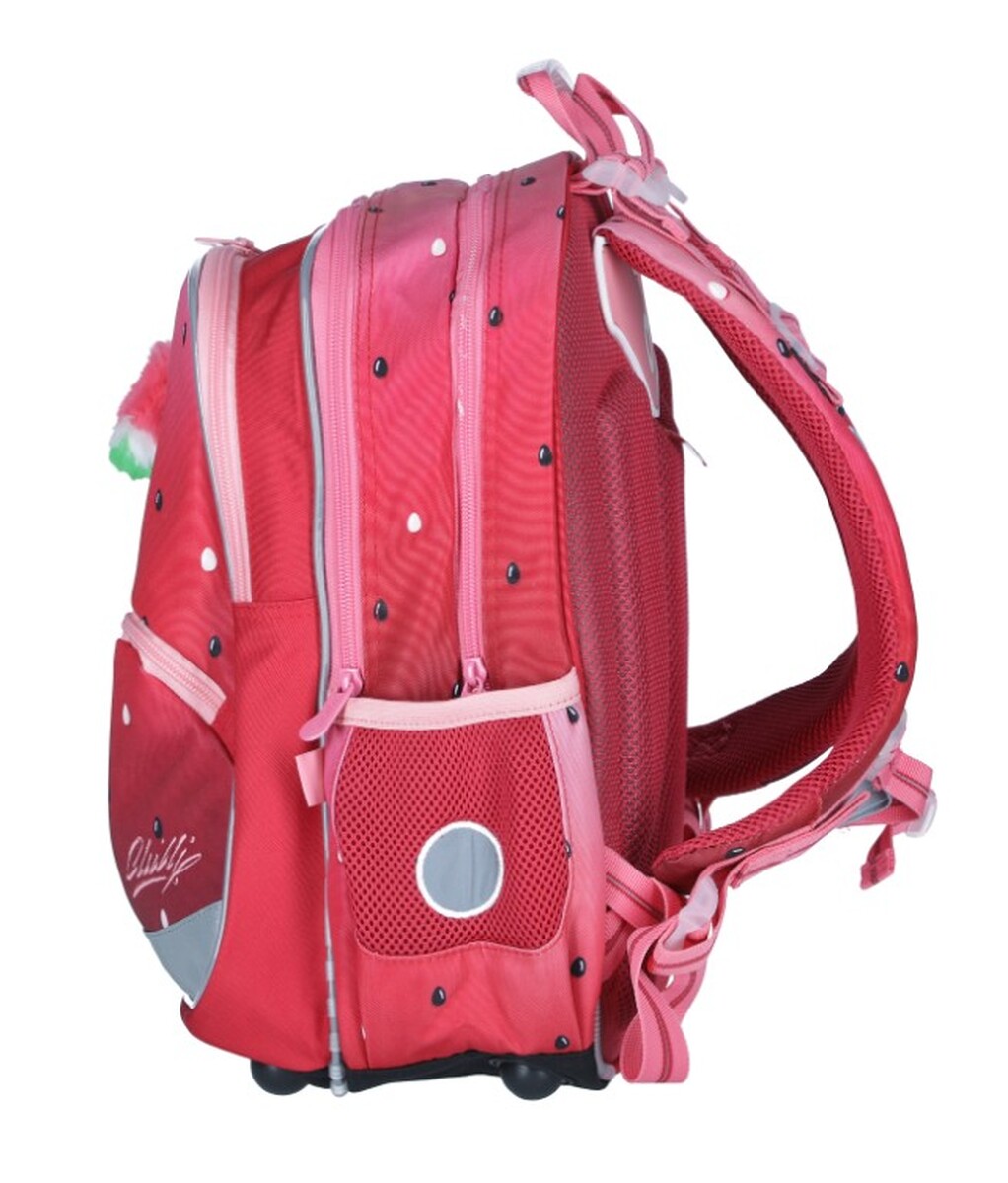 Zadná komora je širšia, vhodná najmä na ťažšie šlabikáre a učebnice. Užšia predná komora zvládne všetko ostatné, pričom sa v nej nachádza aj menovka a sieťované vrecko na zips. Ďalšie vrecko v poradí je, podobne ako chrbtové, hlboké a objemné, vhodné napríklad na umiestnenie desiaty. Vo vnútri je k dispozícii odnímateľná karabínka na kľúče, vďaka ktorej ich školáčky len tak nezapatrošia. Do poslednej najmenšej priehradky sa zmestia všetky ostatné drobnosti.