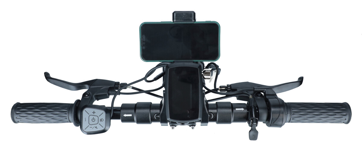 Ďalsím praktickým doplnkom je držiak na mobilné zariadenie, ktorý je zároveň vybavený kompasom a vystražným LED osvetlením z prednej strany. Tento držiak je vskutku pevný a odolný voči poveternostným vplyvom a vie pevne uchytit mobilné zariadenie rôznych veľkostí.