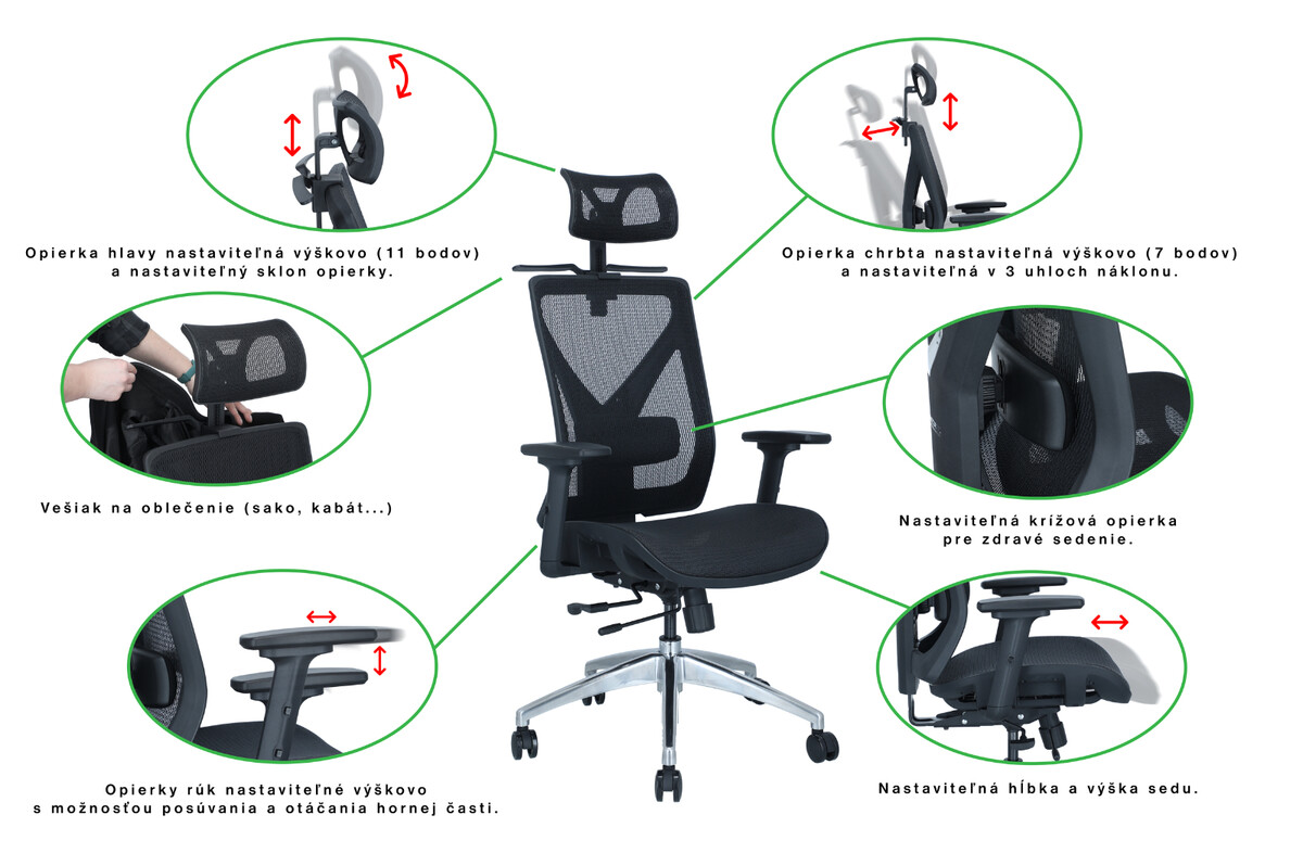 Kancelárska stolička Unizdrav ponúka 7 hlavných ergonomických nastavení, ktoré je možné nakombinovať do presne požadovaných úrovní.