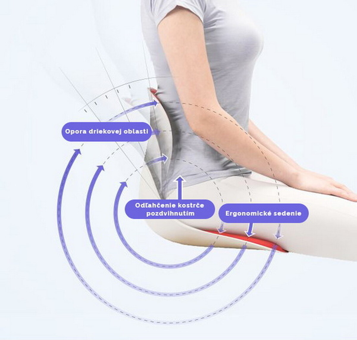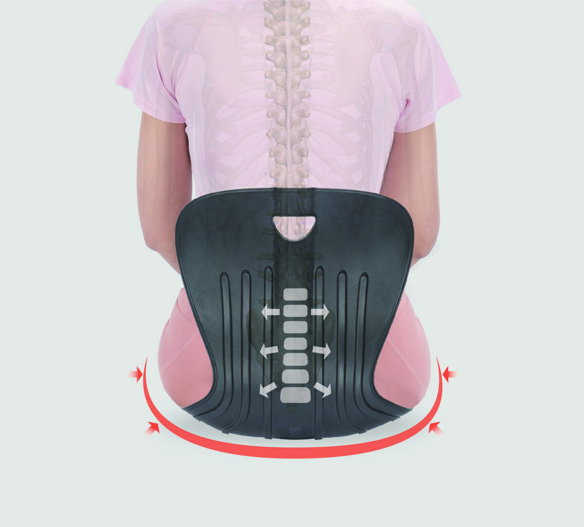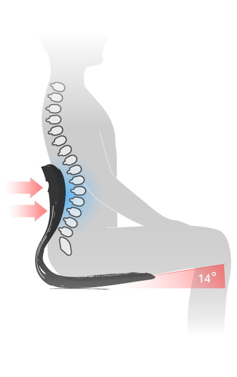 Chrbtová opierka je postavená na unikátnom mechanizme pákového efektu, ktorý tlačí hmotnosť vášho tela do opierky a tým udržuje prirodzené zakrivenie bedrovej chrbtice a redukuje napätie v chrbte. Podsedák je vhodný nielen pre ľudí so sedavým zamestnaním, ale aj pre tých, ktorí trpia pohybovým obmedzením, hrbia sa a pri sedení sa zvyknú kĺzať na stoličke, neprimerane prenášať váhu tela krížením nôh či podopieraním sa.