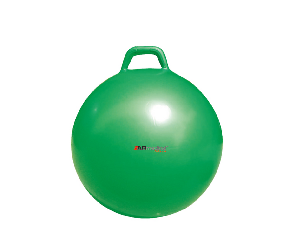 Detská fitlopta má na vrchole malý úchyt, kde sa deti môžu držať, aby neskĺzli z lopty.