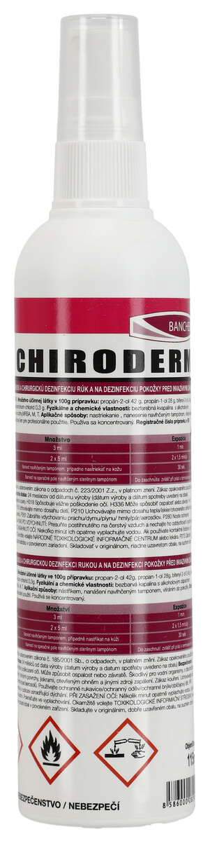 Chiroderm predstavuje veľmi rýchlu pomôcku pri dezinfekcii pokožky. Jeho dôležitou látkou je alkohol, na základe ktorého sa ničia choroboplodné zárodky.