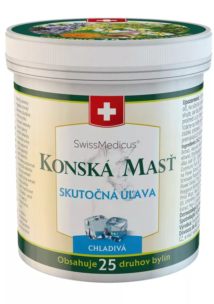 Chladivá konská masť SwissMedicus je bylinný balzam vyrobený podľa tradičnej receptúry s vysokým obsahom extraktov plodov gaštanu konského, kostihoja, rozmarínu a arniky, obohatený o množstvo rastlinných bioaktívnych látok.