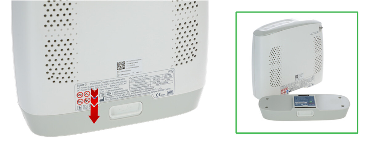 Prenosný kyslíkový koncentrátor je vybavený modulárnou lítiovou batériou, ktorú je možné dobíjať zo štandardnej elektrickej zásuvky. Súčasťou balenia je takisto adaptér na napájanie cez 12 V autozapaľovanie. Maximálna doba nabíjania batérie je približne 3 hodiny a 40 minút (od úplného vybitia po úplné nabitie, v závislosti od zdroja energie a použitia).