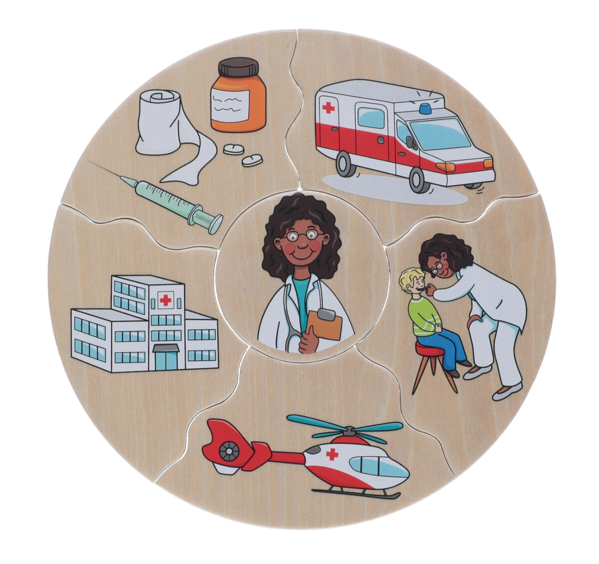 Balenie obsahuje 5 dielov s profesiami lekár, farmár, hasič, stavbár a policajt. Každé povolanie charakterizuje ďalších 6 ilustrovaných dielikov, ktoré do seba zapadajú ako puzzle. Na obrázkoch nájdete pracovné nástroje, vozidlá, či miesto výkonu práce. Úlohou je teda priradiť jednotlivé časti k správnemu zamestnaniu.
