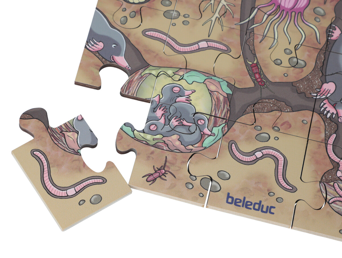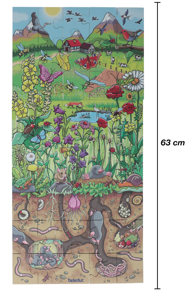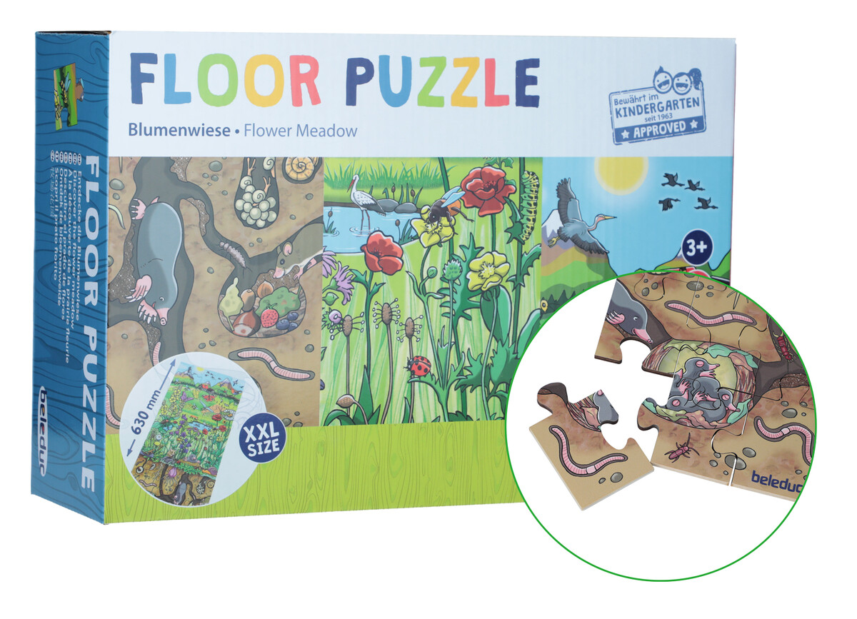 Podlahové puzzle Kvetinová lúka vás prevedie viacerými fascinujúcimi vrstvami života živočíchov a rastlín pod zemou i nad ňou.