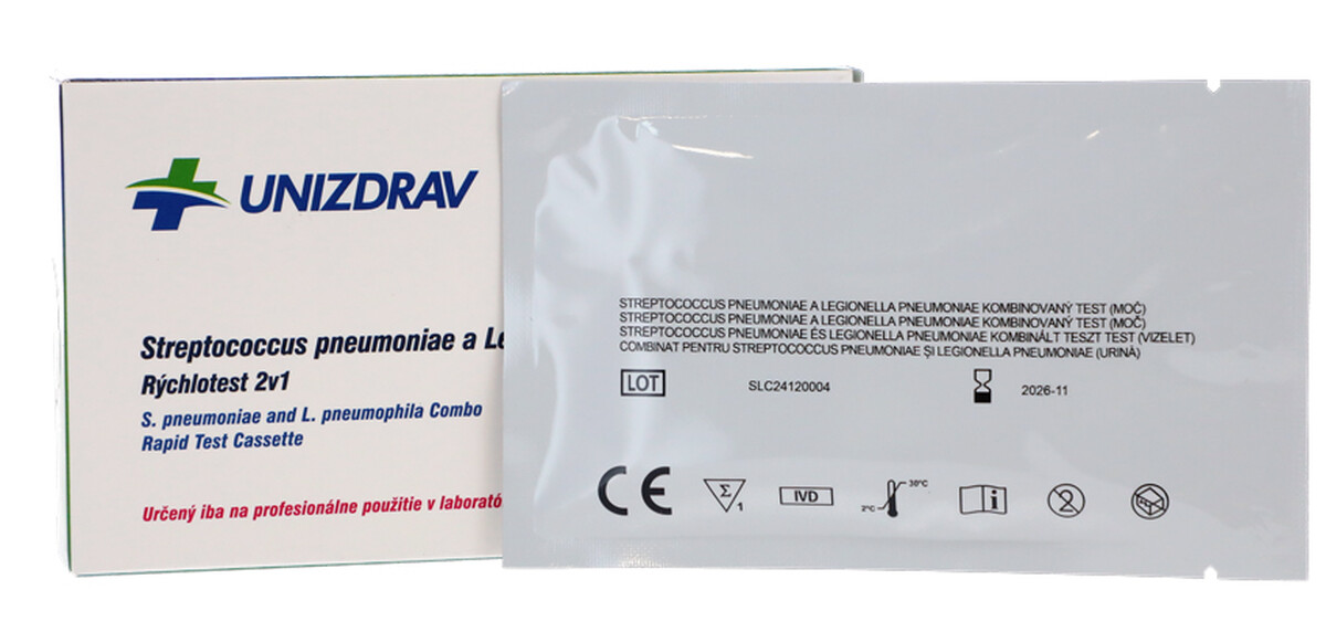Rýchly test na kvalitatívne zistenie antigénu Streptococcus pneumoniae a Legionella pneumophila v ľudskom moči.