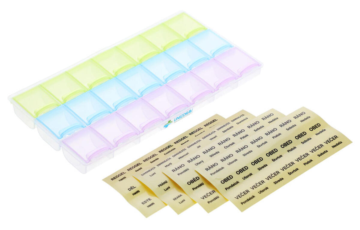 Dávkovač liekov UNIZDRAV umožňuje prehľadné usporiadanie liekov na celý týždeň.