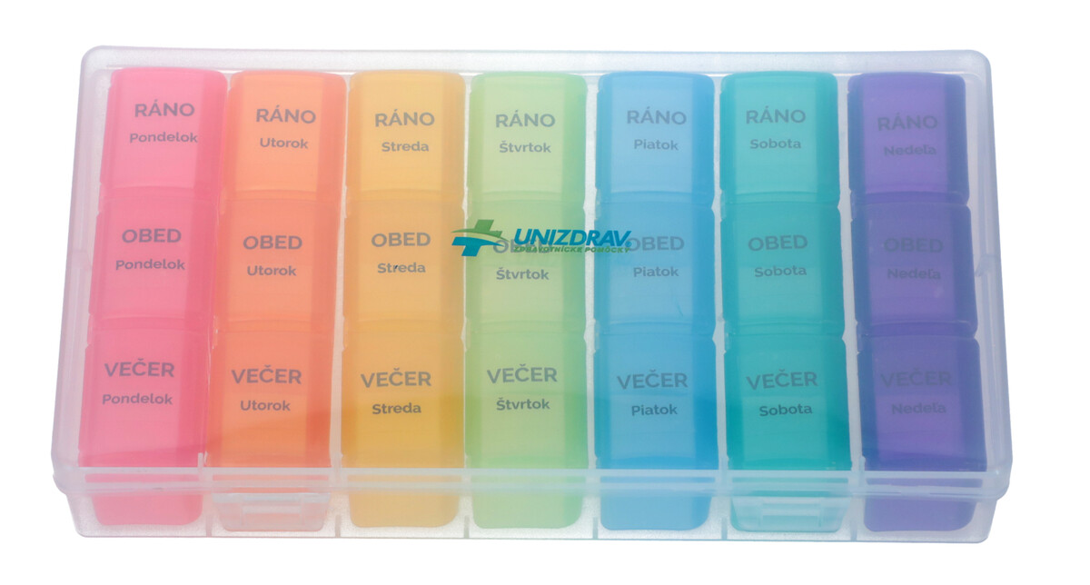 Dávkovač na lieky má 7 jednotlivých, farebne odlišných priehradiek na osobitné dávkovanie liekov RÁNO / OBED / VEČER spolu s označením dňa. Priehradky liekovky sú dostatočne veľké a sú vhodné aj pre pacienta s väčším množstvom predpísaných liekov. Vyberateľné denné priehradky navyše umožňujú pohodlné oddelenie jednotlivých dávok a ich jednoduché prenášanie, pacienti ocenia najmä pri cestovaní.