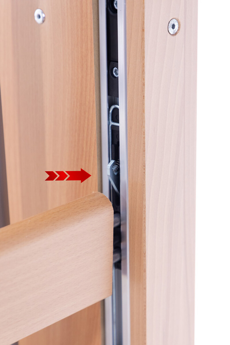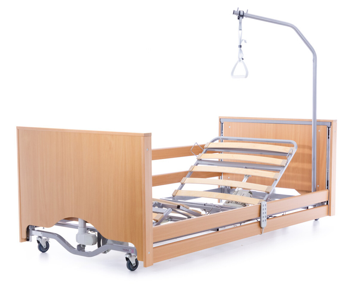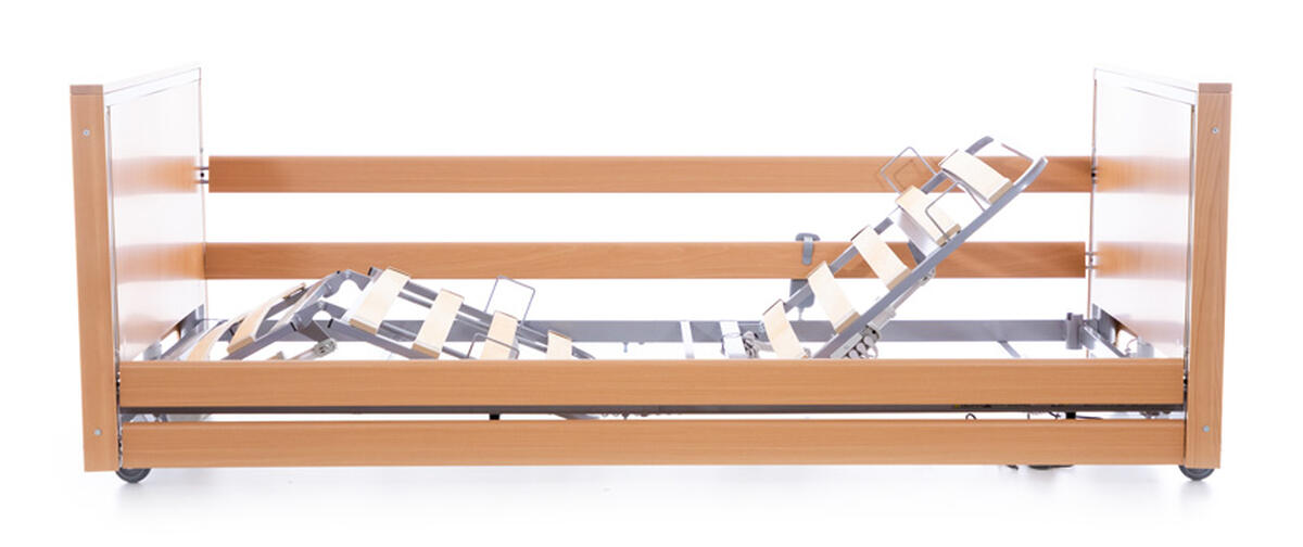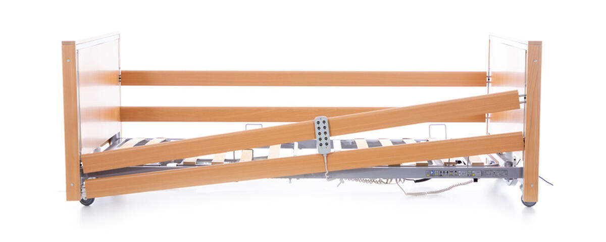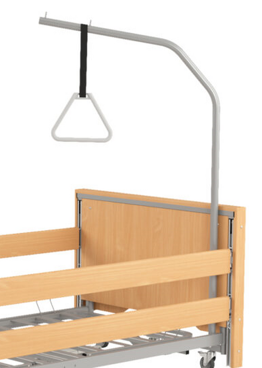 Vo výbave polohovacej postele nechýba ani závesná hrazda, ktorá slúži na odľahčenie zaťažovaných častí tela pacienta a umožňuje meniť jeho polohu. Sklopné drevené bočné zábrany zvyšujú bezpečnosť pred pádom.