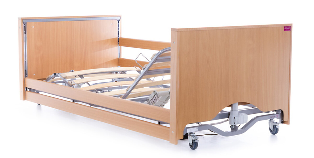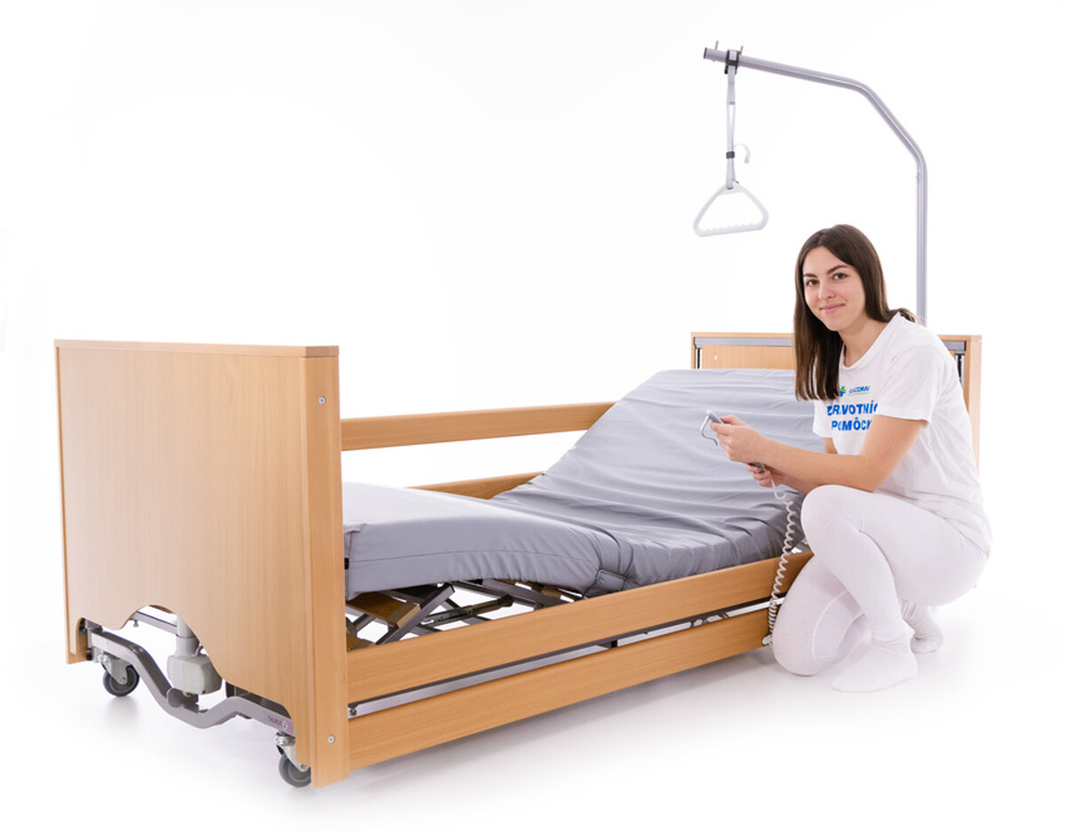 Pojazdná polohovacia posteľ s možnosťou zníženia roštu až k podlahe poskytuje dlhodobo ležiacim pacientom potrebný komfort a bezpečnosť.