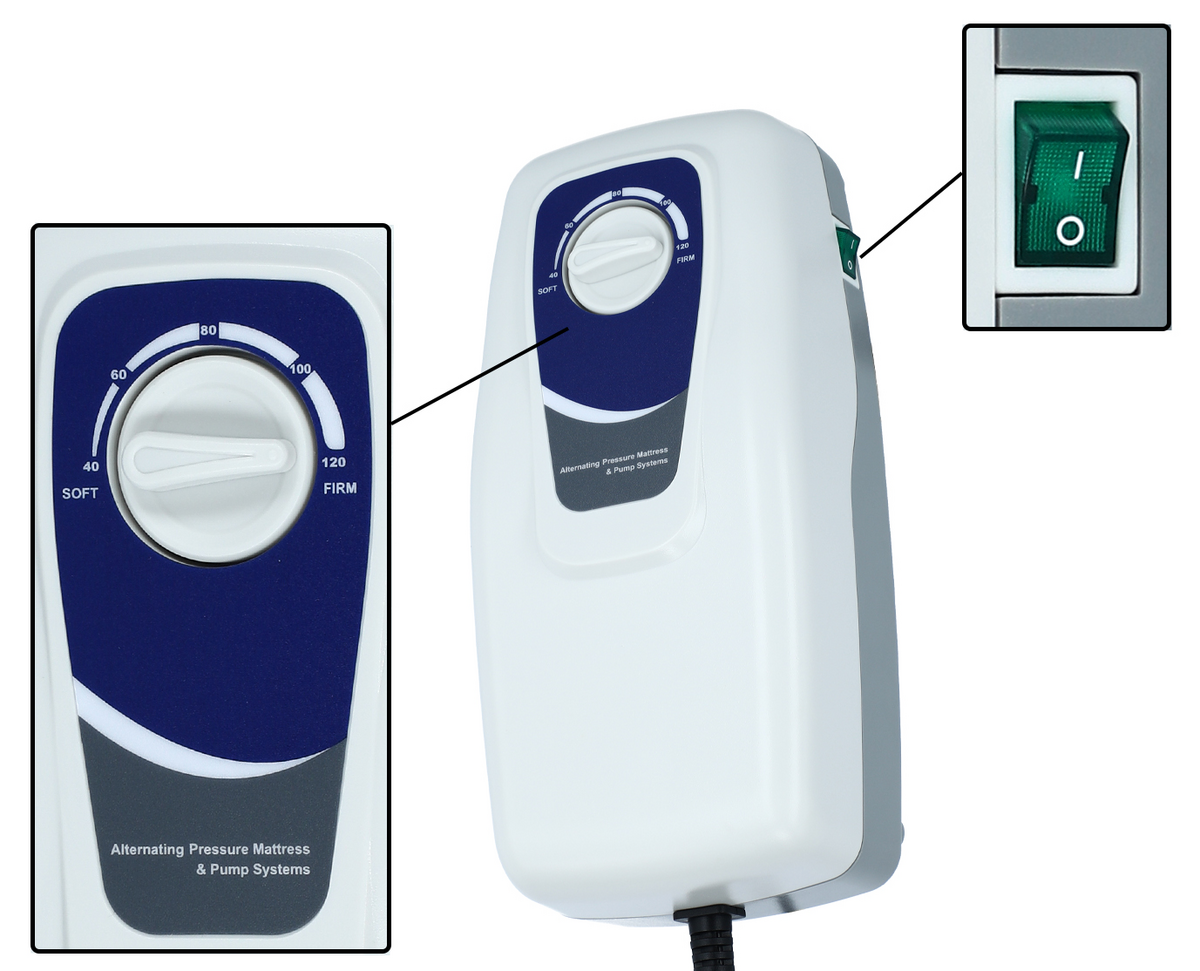 Matrac položte na lôžko tak, aby hadička privádzajúca vzduch bola uložená pri nohách. Skontrolujte, či sú všetky komory a bublinky spojené. Nastavte vypínač do pozície vypnuté (0). Zapojte pumpu do elektrickej siete, následne zapojte silou hadičku do vzduchového otvoru, na boku pumpy. Pumpu postavte na tvrdý povrch. Uložte hadičky tak, aby neboli stlačené alebo ohnuté a zapnite vypínač. Regulátor tlaku nastavte na maximum, to skráti čas napumpovania. Ak je matrac napumpovaný nastavte tlak podľa potreby pacienta.