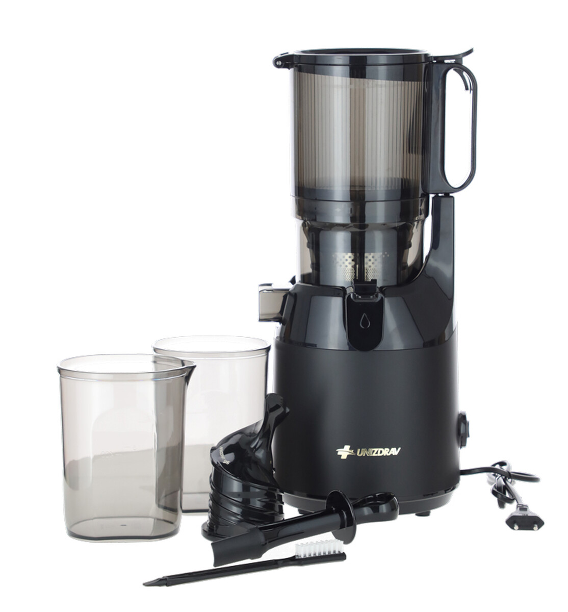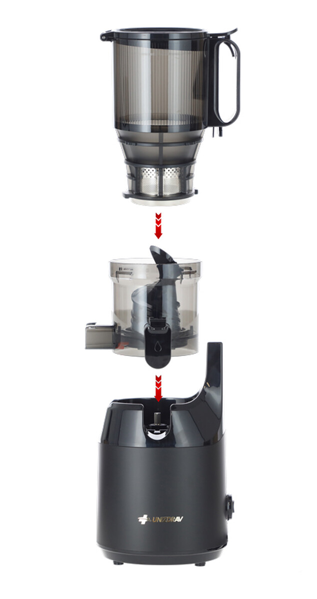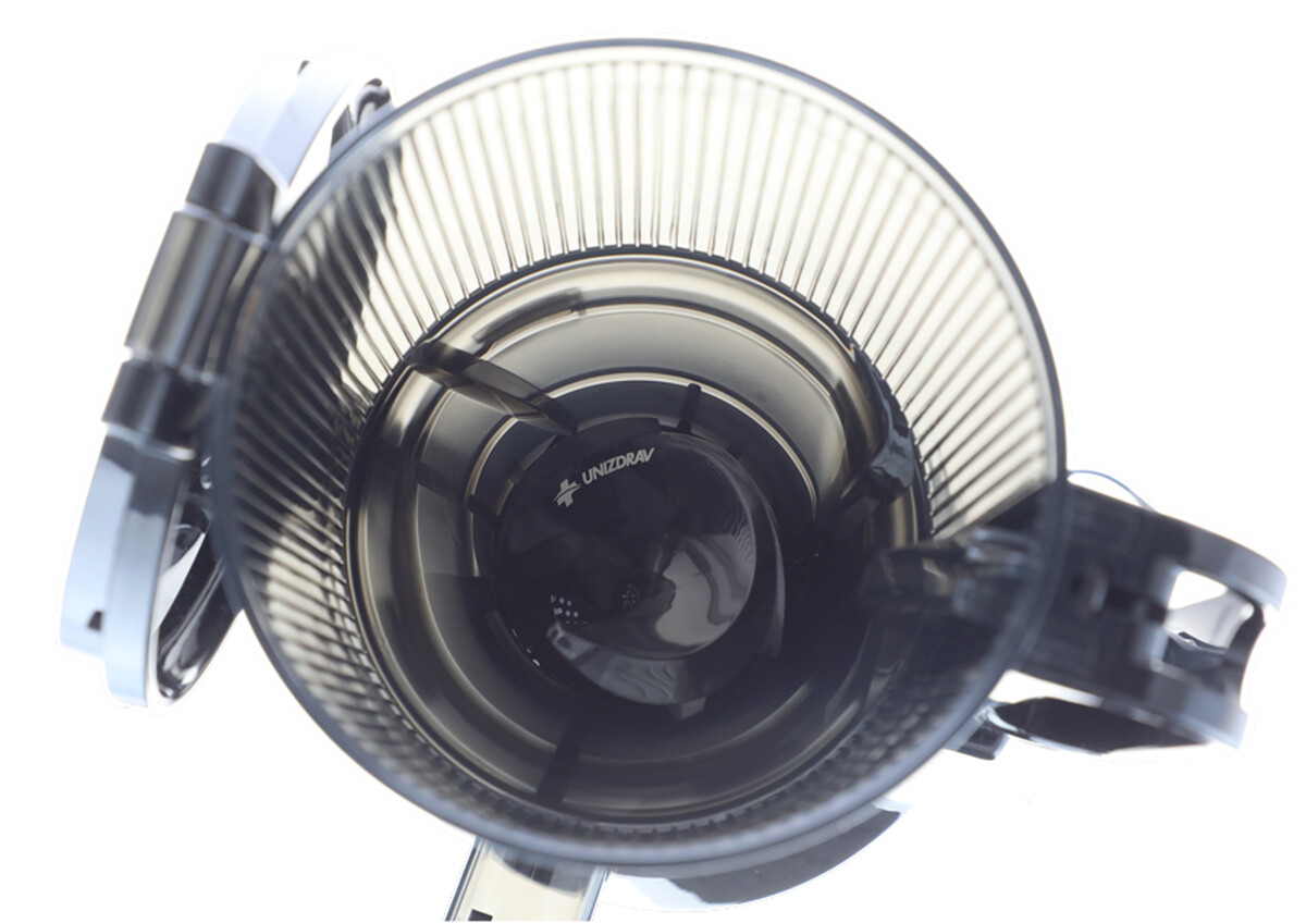 Šnekový odšťavovač UNIZDRAV bol nadizajnovaný s XXL plniacim otvorom s priemerom až 13 cm. Do dostatočne veľkého otvoru je možné vkladať naraz aj väčšie kusy ovocia a zeleniny, čo ušetrí čas prípravy aj lisovania. Nádoba na šťavu pojme cca 1000 ml tekutiny, nádoba na odpad 800 ml.