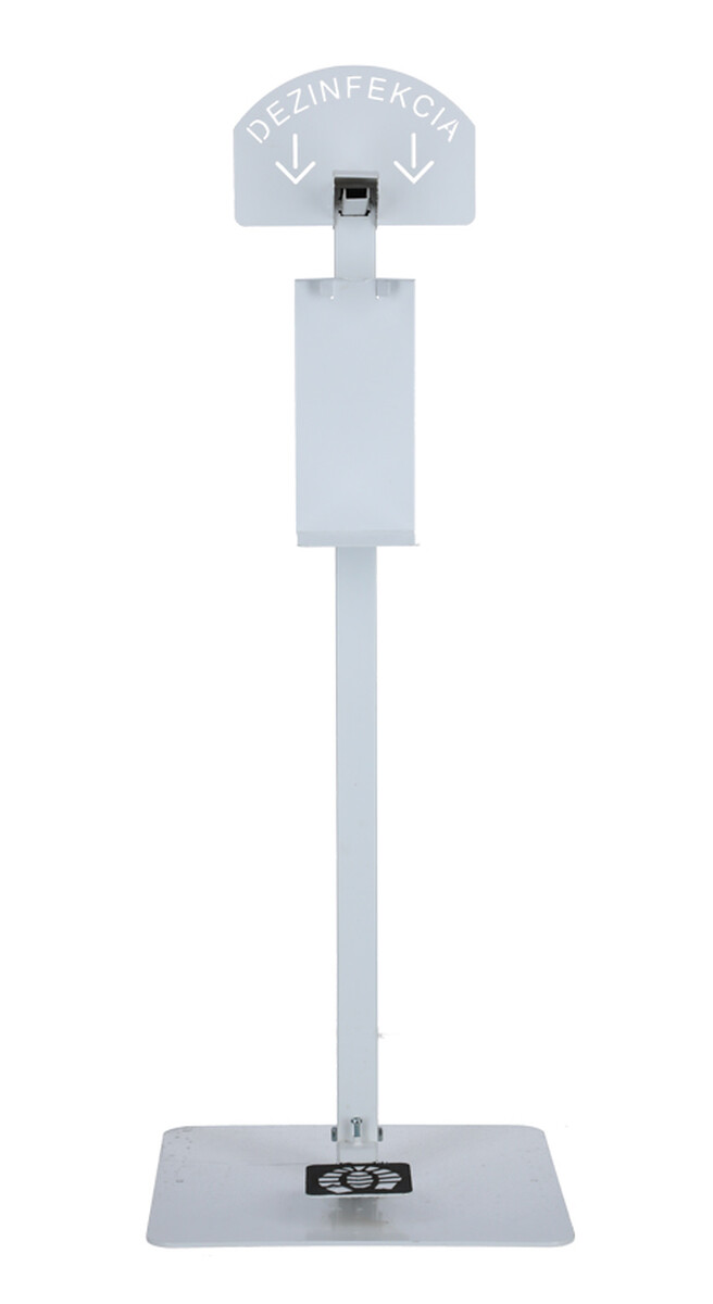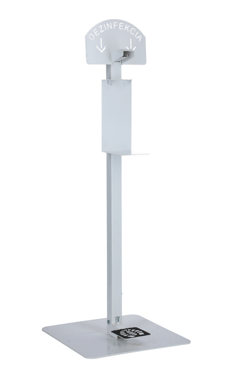 Stojan na dezinfekciu rúk má bielu farbu a informačný nápis.