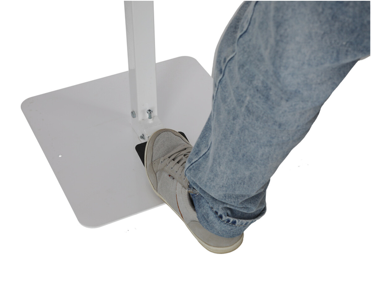 Bezdotykový dezinfekčný stojan s pedálovým dávkovačom ideálny na umiestnenie pred vstupom do obchodov, budov a komerčných priestorov.